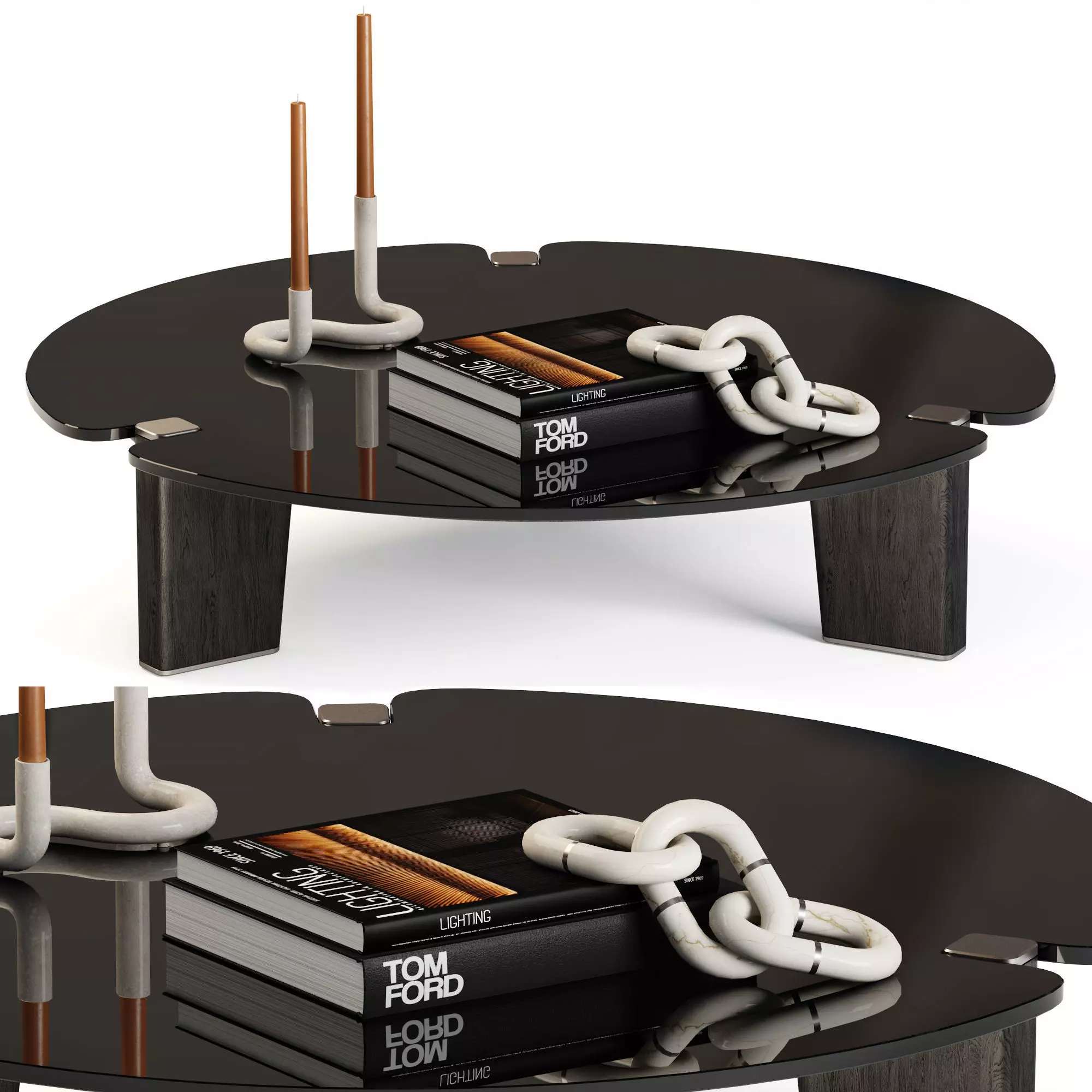 Decor on the top: 2 books, double candle holder with two candles, marble chain