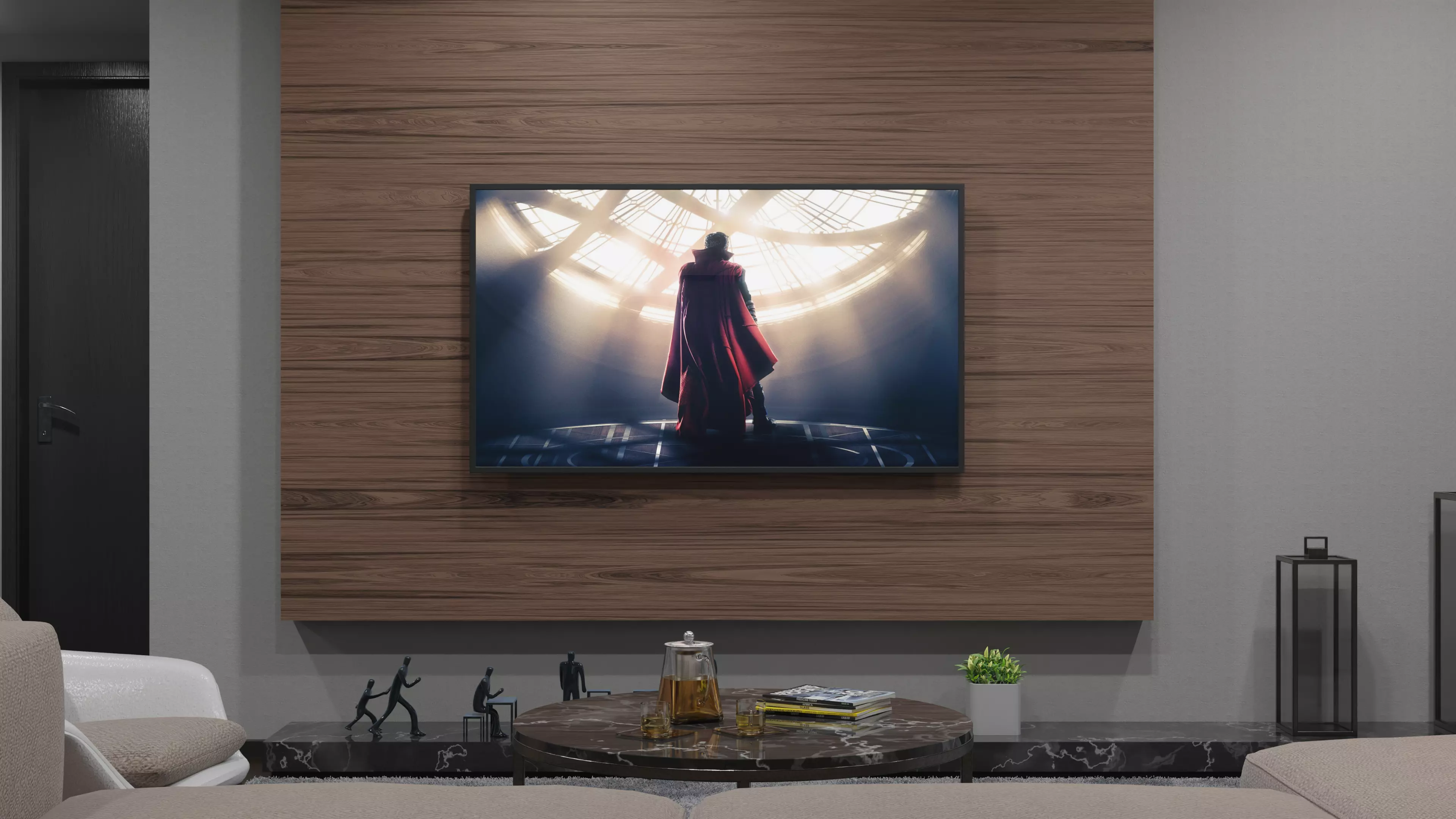 This modern living room is a masterclass in contemporary minimalism, blending warm organic textures with a sophisticated, moody color palette. The space is anchored by a deep navy-blue accent wall that provides a dramatic backdrop for the seating area, contrasting beautifully with the light grey armchair and the plush, sandy-toned sectional sofa. To the left, a large floor-to-ceiling wooden panel serves as a striking focal point, housing a sleek wall-mounted television. This vertical wood grain adds a touch of natural warmth, balancing the cooler tones of the grey shag rug and the dark marble plinth running along the base of the wall.Light plays a crucial role in this design. The room is flooded with soft, natural light coming through expansive glass doors that lead to a private balcony, offering a seamless connection to the outdoors. For evening ambiance, the space features diverse lighting layers: a modern, arcing floor lamp leans over the sofa, while a classic tripod lamp with a cream shade provides a cozy glow in the corner.The decor is curated and intentional. Small sculptural figures and minimalist planters sit atop the marble ledge, while abstract line art on the blue wall adds a gallery-like feel. A lush green indoor plant tucked in the corner breathes life into the composition. The furniture—characterized by clean lines and low profiles—creates an unobstructed flow, making the room feel both spacious and intimate. This interior is a perfect example of refined urban living, where comfort meets high-end architectural design.