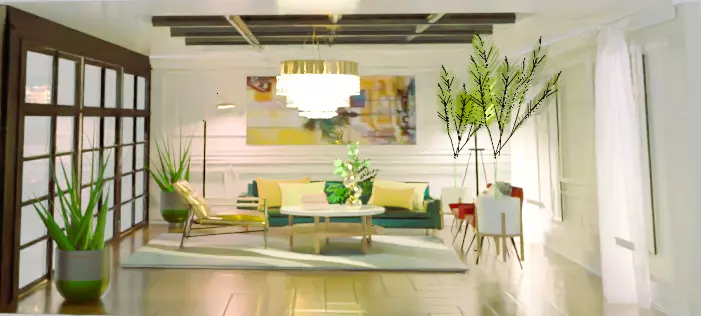This 3D model is a meticulously crafted Modern Elegant Living Room that showcases a harmonious blend of contemporary design elements and sophisticated aesthetics. The room features a spacious layout, bathed in natural light streaming through large glass-paneled doors, creating an inviting and airy atmosphere. The color palette is a mix of warm, earthy tones and cool, refreshing greens, accentuated by the soft, golden glow of the overhead chandelier, which adds a touch of luxury and warmth to the space.