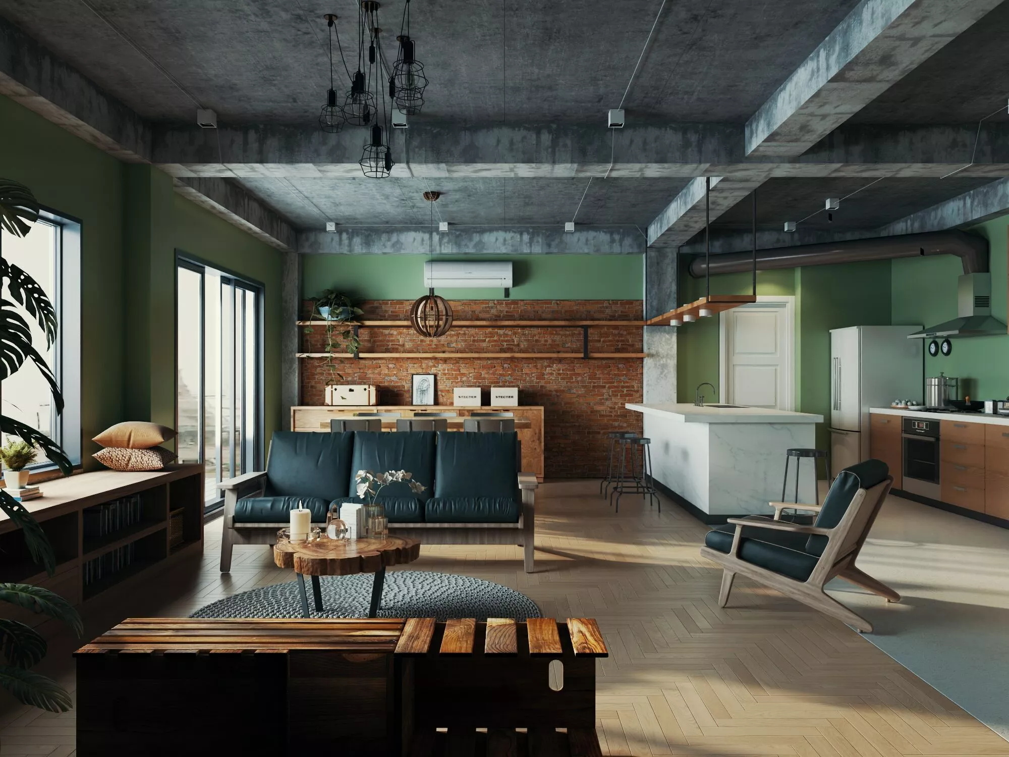 Professional high-quality 3D complete scene of a Modern Industrial Loft meticulously crafted for high-end residential interior visualization and architectural projects. This comprehensive asset features a spacious open-plan living environment including a stylish wooden sofa set mid-century lounge chairs a rustic brick accent wall a fully equipped modern kitchen with a marble island and industrial-style exposed concrete ceilings with decorative pendant lighting.