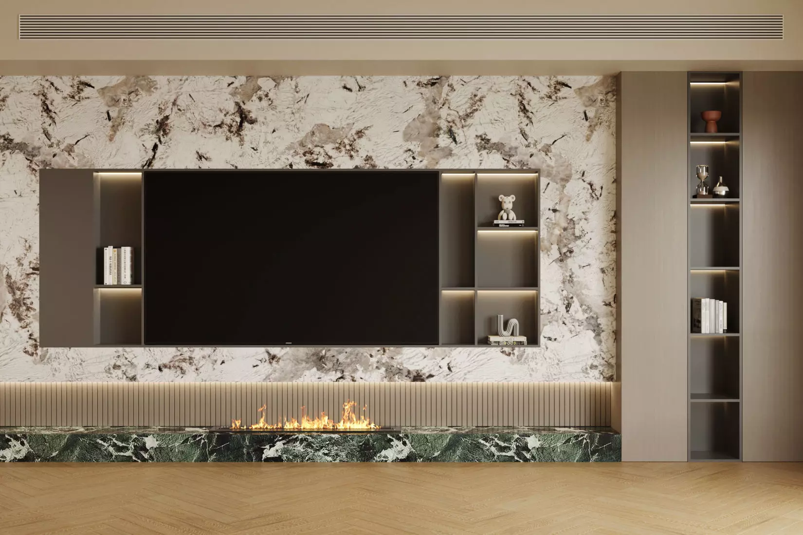 This is a modern light-luxury marble feature wall. The main body is made of off-white marble with unique textures, where the natural gray-black veins interweave like artistic brushstrokes, creating a strong visual impact. A large black TV is embedded in the middle, and the embedded storage compartments on both sides are highlighted with warm lights, displaying books, art ornaments, and trendy toys, adding a touch of life and design sense. The green marble countertop below is paired with a linear fireplace, where the flames dance nimbly, forming a cold-warm contrast with the cool-toned marble above. Combined with the herringbone parquet wooden floor, the overall space creates an exquisite and layered atmosphere. It is an artistic feature wall design that integrates decoration, storage, and atmosphere creation.