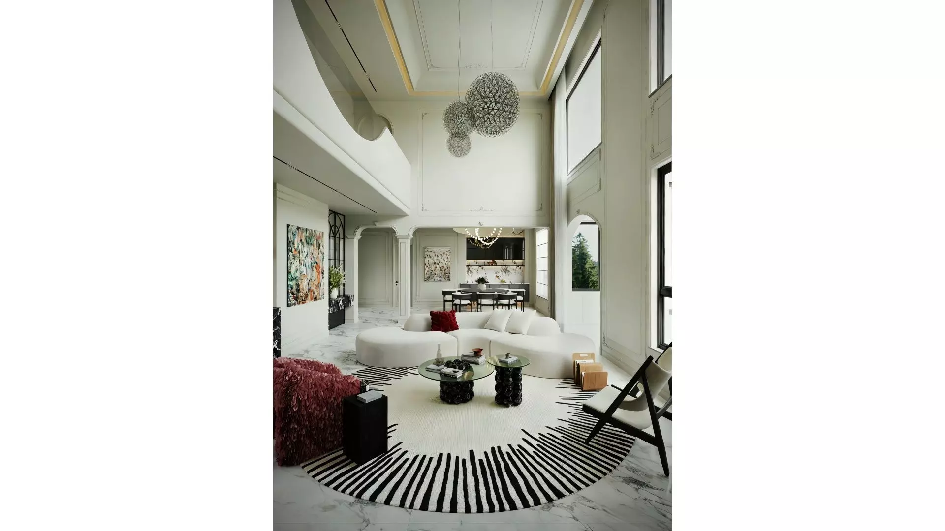 In the center of the living room, a large curved white sofa is paired with striking red throw pillows, creating a visual echo with the red feathered armchair beside it. The floor is covered with a black-and-white zebra-striped circular rug, complemented by a coffee table with a glass top and a black sculptural base, exuding artistic tension.Three spherical art chandeliers hang from the ceiling, their metallic woven structures harmonizing perfectly with the high-ceilinged space. Large floor-to-ceiling windows flood the room with ample natural light, enhancing its sense of openness and transparency. The open-plan dining area in the background, along with the art paintings, further elevates the overall artistic sensibility and refined elegance, making it a model of modern luxury that seamlessly blends comfort and aesthetics.