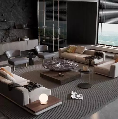 a luxurious and contemporary living room with a sophisticated, dark, and moody ambiance.Seating Arrangement: The room features a spacious and modular seating arrangement. There are two light-colored, low-profile sofas positioned to face each other, adorned with plush throw pillows in varying textures and subtle patterns. Additionally, there are two sleek, grey armchairs with a minimalist design placed near a side table.Coffee Tables: A striking, round coffee table with a dark, possibly marble or stone, top and a sculptural base sits centrally. A lower, rectangular coffee table in a dark wood or stone finish is positioned beneath it, creating a layered effect. A smaller, round side table with a slender metal frame stands next to one of the sofas.Rug: A large, dark grey area rug with subtle linear patterns covers the floor, anchoring the furniture arrangement and adding texture to the space.Wall Treatments: The walls are predominantly dark. One prominent wall features a textured, dark grey or black stone-like surface with built-in shelving showcasing minimalist decorative objects. Another wall appears to be a smooth, dark grey or black, possibly with a concealed fireplace running along the bottom near the window.Lighting: The room utilizes a combination of natural and artificial light. Natural light streams in from a large window fitted with dark horizontal blinds, offering a glimpse of a bright outdoor scene. Artificial lighting includes a modern table lamp with a spherical white diffuser placed on the armrest of one sofa, providing a soft glow.Decorative Accents: The room is sparsely decorated, emphasizing clean lines and high-quality materials. Throw blankets are casually draped over the sofas, adding a touch of comfort. Books and a few sculptural objects are placed on the tables.Architectural Features: A modern, possibly glass-enclosed, staircase is partially visible in the background, suggesting a multi-level dwelling.