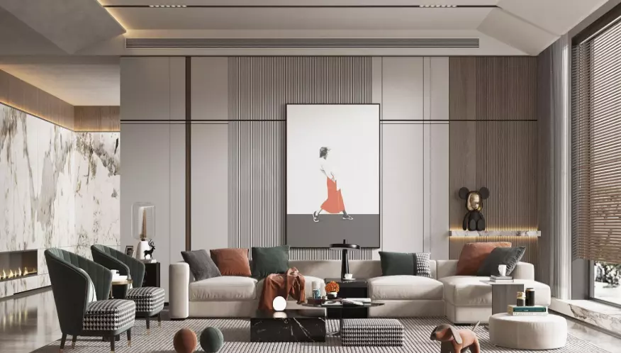 Spacious Seating Area: A large, off-white sectional sofa dominates the central part of the room, offering ample seating. It's adorned with several throw pillows in various textures and muted tones like olive green, rust, and grey, adding depth and visual interest. A cozy throw blanket is casually draped over one section.Coffee Table Ensemble: In front of the sofa, there's a striking black marble coffee table with gold veining. It holds a collection of decorative objects, including books, candles, and a sculptural piece. A smaller, round black table with a slender gold leg is positioned nearby, also holding decorative items.Accent Chairs: Two elegant armchairs with a curved back design and black and white patterned upholstery are placed to the left of the sofa, providing additional seating options.Ottomans: A matching black and white patterned ottoman sits near the armchairs, and a round, off-white ottoman is positioned at the other end of the sectional.Artwork: A large, framed piece of contemporary art hangs on the wall behind the sofa. It features a figure in motion with splashes of orange and grey, serving as a focal point.Decorative Accents: Throughout the room, various decorative items enhance the aesthetic, including a bear-like figure on a shelf, small sculptures, and what appears to be a diffuser or small lamp on the coffee table.Lighting: The room features a combination of ambient and accent lighting, including recessed ceiling lights and potentially lamps (partially visible).