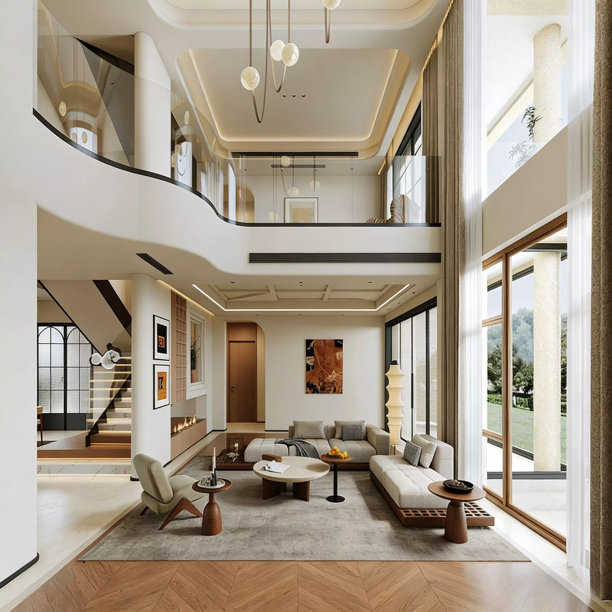 This is a double-height living space that blends modern luxury with a creamy wabi-sabi style. The overall color palette is dominated by off-white, light gray, and natural wood tones, creating a warm and soft atmosphere. The double-height design, paired with a main-light-free ceiling and artistic chandeliers, makes the space feel more open and airy. The glass-railed staircase on one side features smooth lines, offering both transparency and a strong sense of design.The living room is furnished with light-colored modular sofas, a natural wood coffee table, and a leisure armchair, complemented by artistic paintings and exquisite soft furnishings, achieving a perfect balance of comfort and aesthetic depth. The large floor-to-ceiling windows on the right flood the space with ample natural light, seamlessly connecting the outdoor greenery with the interior. The overall atmosphere is one of sophistication, relaxation, and rich natural texture, ideal for modern families who pursue quality and aesthetics in their living environment.