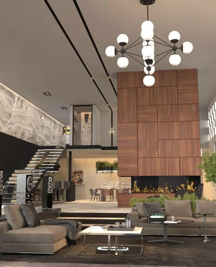 High-End Living Room Design: This 3D model showcases a high-end living room design. The room is elegantly furnished with high-end furniture and accessories. The large fireplace is the centerpiece of the room, and it is surrounded by a beautiful wood paneling. The room is bathed in natural light from the large windows, and the overall effect is one of luxury and sophistication. This model is perfect for anyone who wants to create a truly stunning living space.