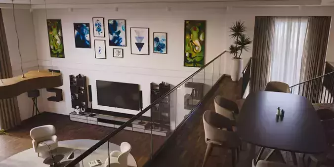 This is a high-quality, fully textured, and render-ready interior scene featuring a spacious double-height living area with a mezzanine dining floor. Perfect for architectural visualization, interior design inspiration, or high-end VR/game environments.