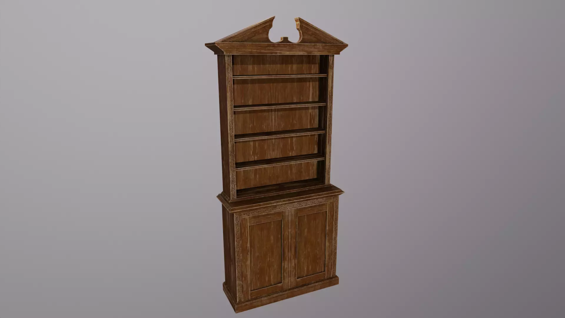 A high-quality 3D model of an antique and worn wood bookshelf that reflects classic craftsmanship - rich timber details and ornate mouldings. Optimized for modern pipelines (3,096 polygons / 6,060 triangles) and a real-world height of 200 cm, this model strikes the balance between quality and performance. Suitable for architectural visualisations, high-quality interior renders, game environments, VR/AR applications, or film/animation projects.