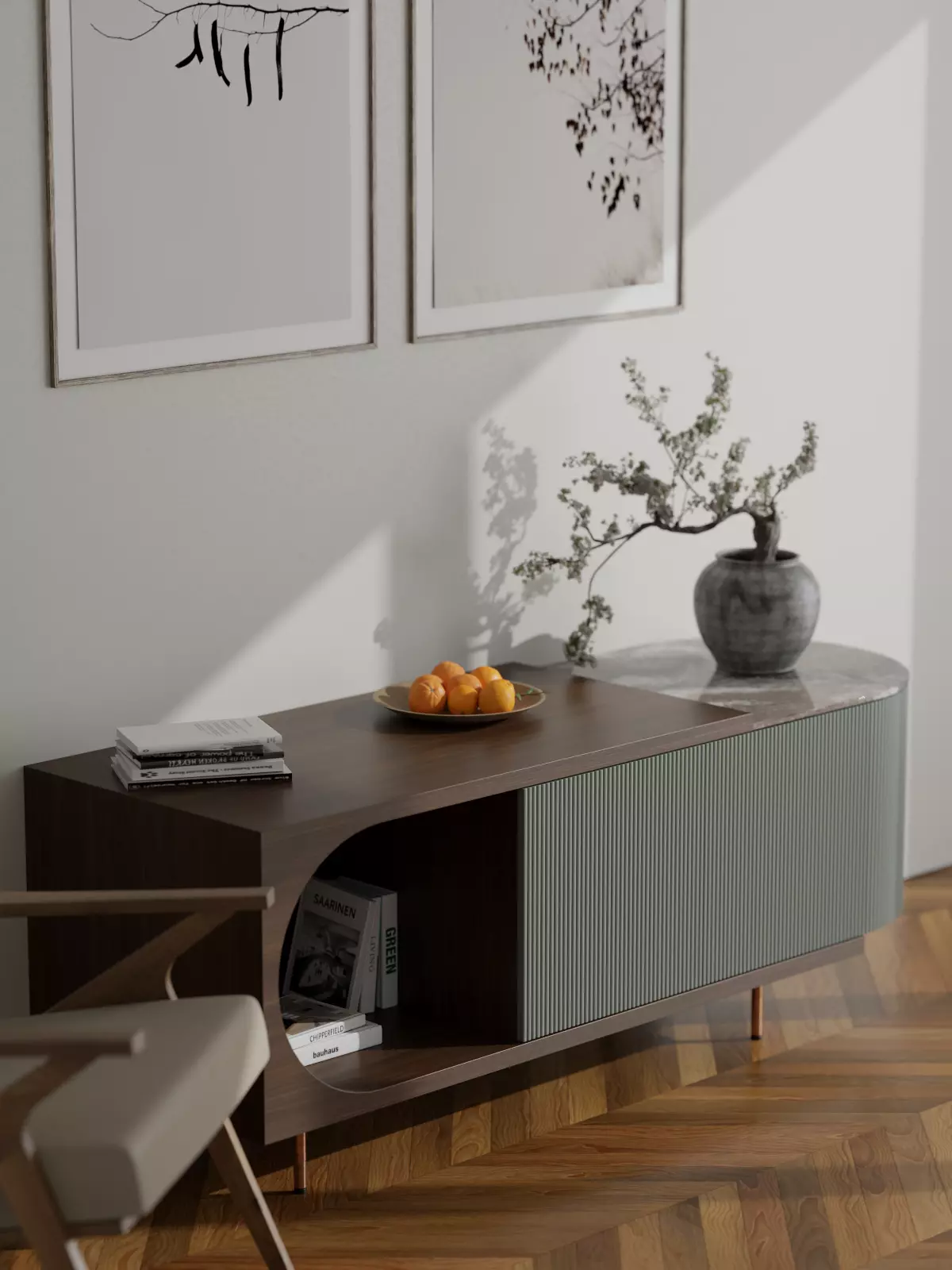 Cabinet Elegant luxury is an elegant and functional piece of furniture art. Made from high quality materials such as wood veneer, stone and milled green MDF, it brings luxury and sophistication to any space.