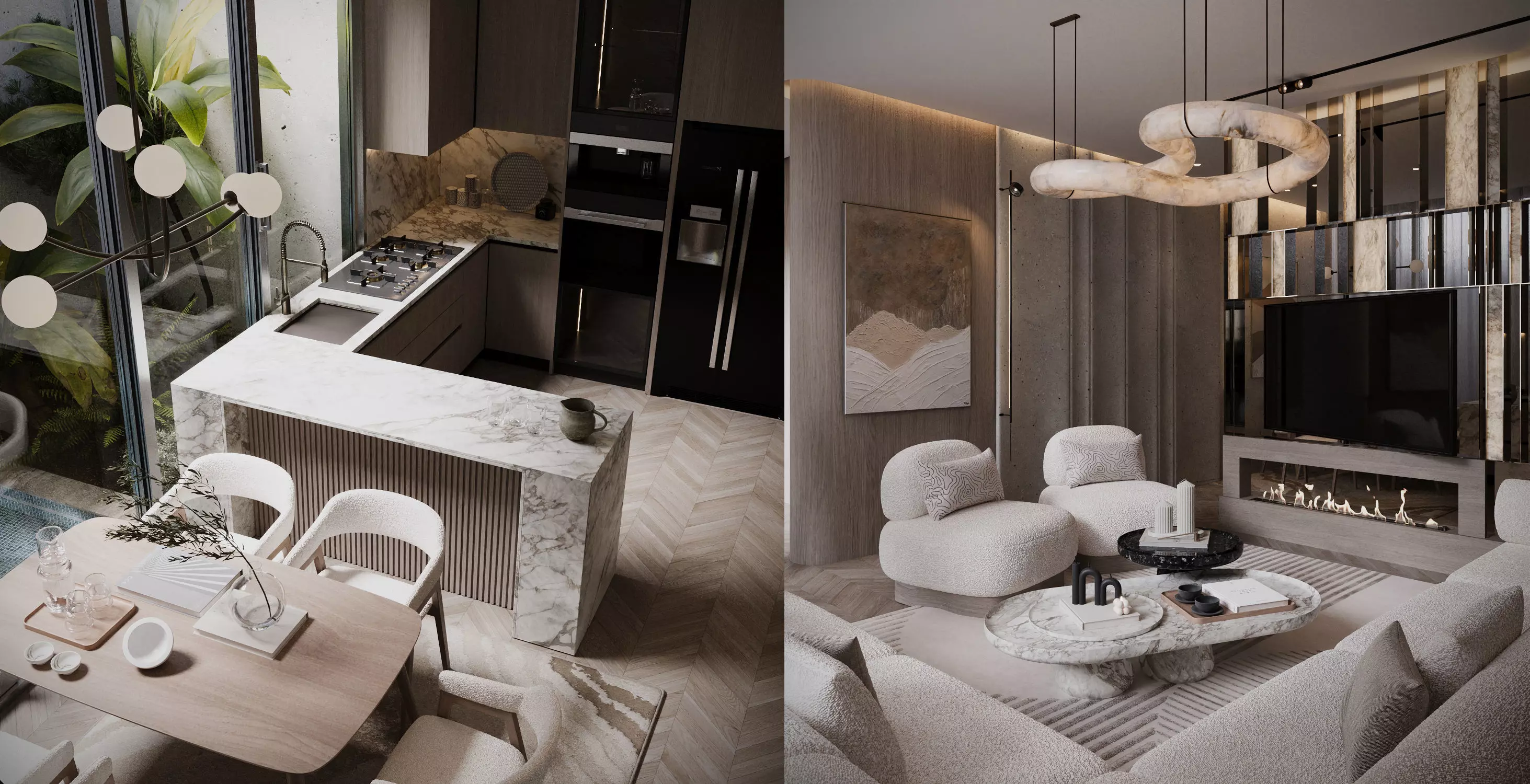 This professionally designed open-space interior scene combines a warm minimal living room with a modern kitchen and dining area, creating a calm and sophisticated residential environment.