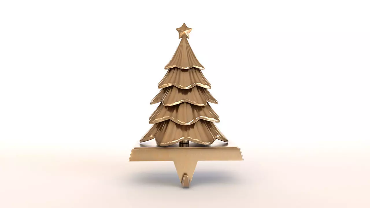 Pine tree shaped brass hanger for the Christmas stockings in your holiday scenes. High quality, photo real model with 4K PBR textures that allow for close-up renders. Modeled in Maya 2023 and rendered in Arnold. The mesh is centered at the origin (0,0,0) with the pivot point at the bottom of the flat part of the hanger’s stand so you can easily snap the hanger to a shelf or a fireplace mantel.