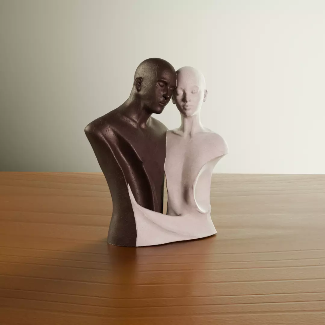 The model features two intertwined busts with distinct surface finishes, creating a strong visual dialogue between light and dark materials. Subtle anatomical definition, smooth transitions, and soft surface imperfections give the sculpture a tactile, handcrafted feel while maintaining a clean, modern aesthetic.