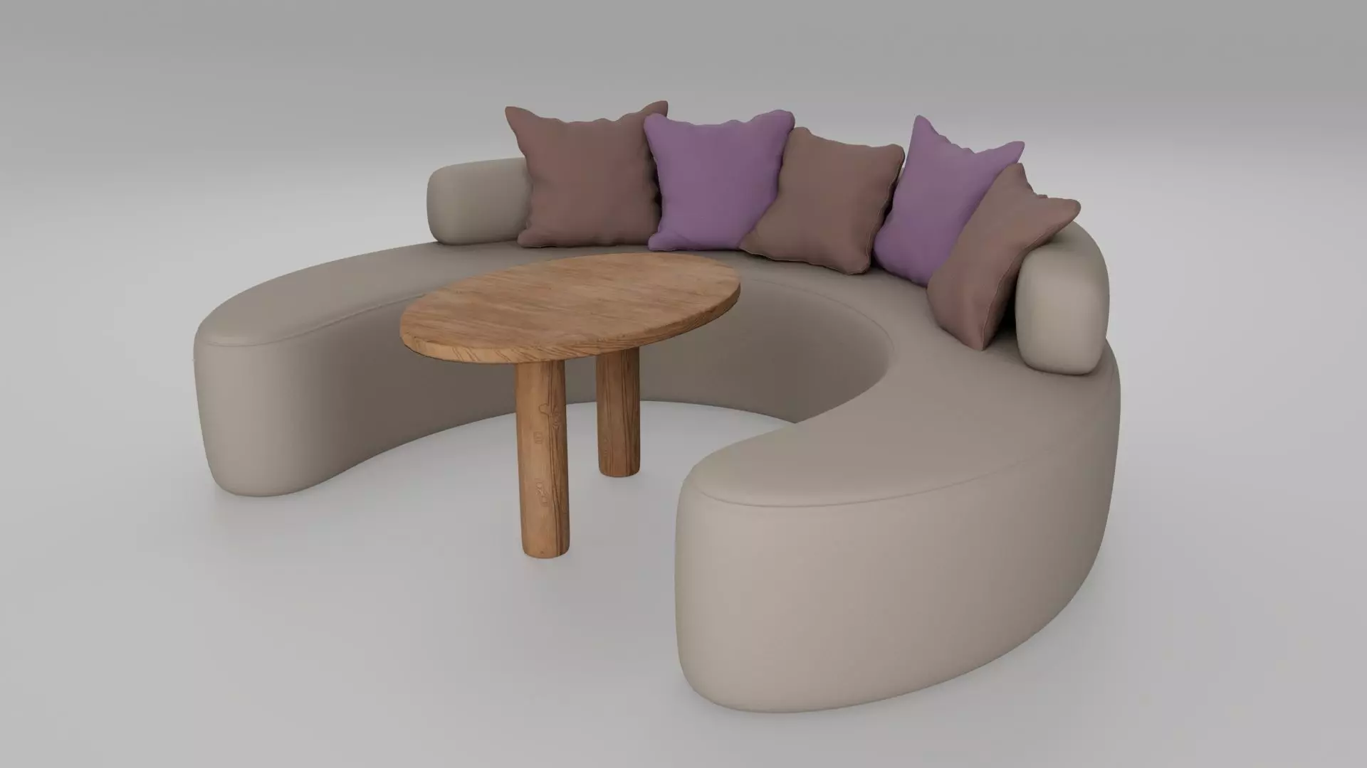 Modern 3D Circular Sofa with Wooden Coffee Table.This model features a stylish, curved sofa design with smooth organic forms and plush cushions in muted earthy tones accented with soft purples. The accompanying wooden coffee table adds warmth and natural texture, making this set perfect for contemporary interiors, lounges, cafés, or hospitality projects.Optimized for rendering and interior visualization, this asset is ready to use in architectural projects, VR/AR environments, and design presentations.