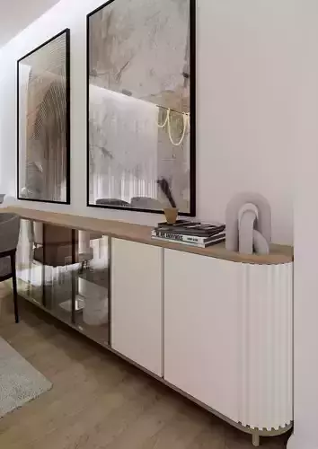 The sideboard in the image is a sophisticated and modern piece that seamlessly blends functionality with aesthetic appeal. Featuring a long, streamlined structure, it combines a natural wood top with a mix of glass and solid panel doors. The left side showcases transparent glass panels framed in a dark finish, offering a glimpse of neatly arranged items inside, while the right side features smooth, cream-colored doors that provide concealed storage. A standout design element is the rounded, fluted texture on the right end, adding a touch of elegance and visual interest. Resting on small, rounded wooden legs, the sideboard maintains a light and airy presence in the space. Styled with carefully curated decor, including stacked books, a sculptural ornament, and a small terracotta pot, it complements the surrounding modern interior. The backdrop of large, abstract framed artwork further enhances its contemporary, minimalist charm, making it a perfect addition to a refined living or dining area.