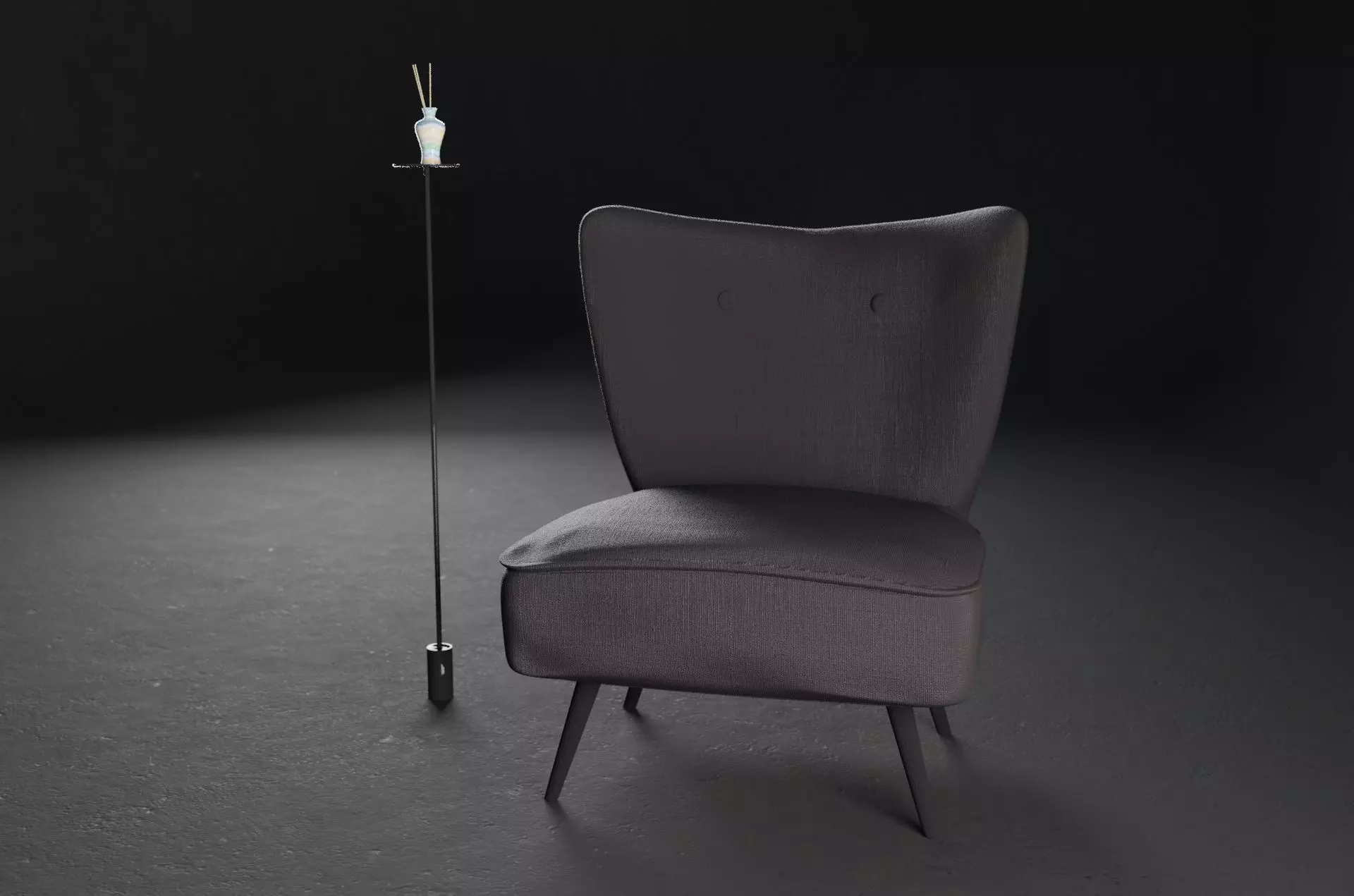3d model of a living room with a single seater sofa and a little table with perfume. The model was made in blender 2.82 and rendered in cycles, so lights, material and texture are set and included.