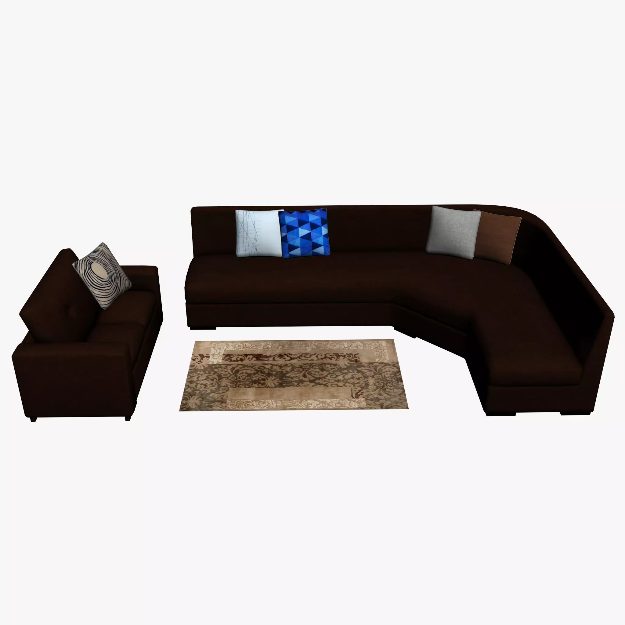 • There is a sitting arrange with 1 double seated sofa, 1 long seated L shape sofa with 5 cushions and a beautiful Rug (3d models) in this package.