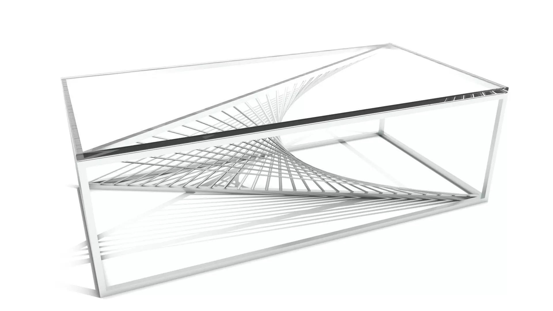 A sleak and modern square metal framed coffee table with 28 wire supports arranged into a elegant spiral with a thick glass table top.
