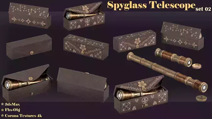 This collection includes a classic handheld spyglass telescope and a beautifully designed wooden box. The model is crafted with high precision and detailed textures, making it ideal for various projects such as game development, animation, architectural visualization, and advertising.