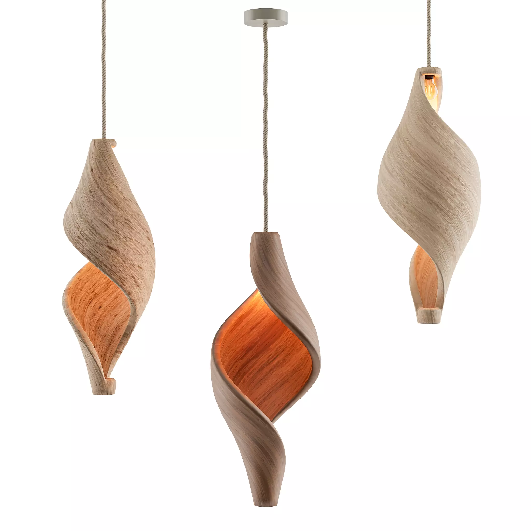 Elegant organic pendant lamp inspired by Wabi Sabi design and the beauty of natural imperfection.The Swirl Pendant features three sculpted wooden variants (Light Oak, Walnut, Ash) that create a warm, inviting glow and a soft handcrafted look.