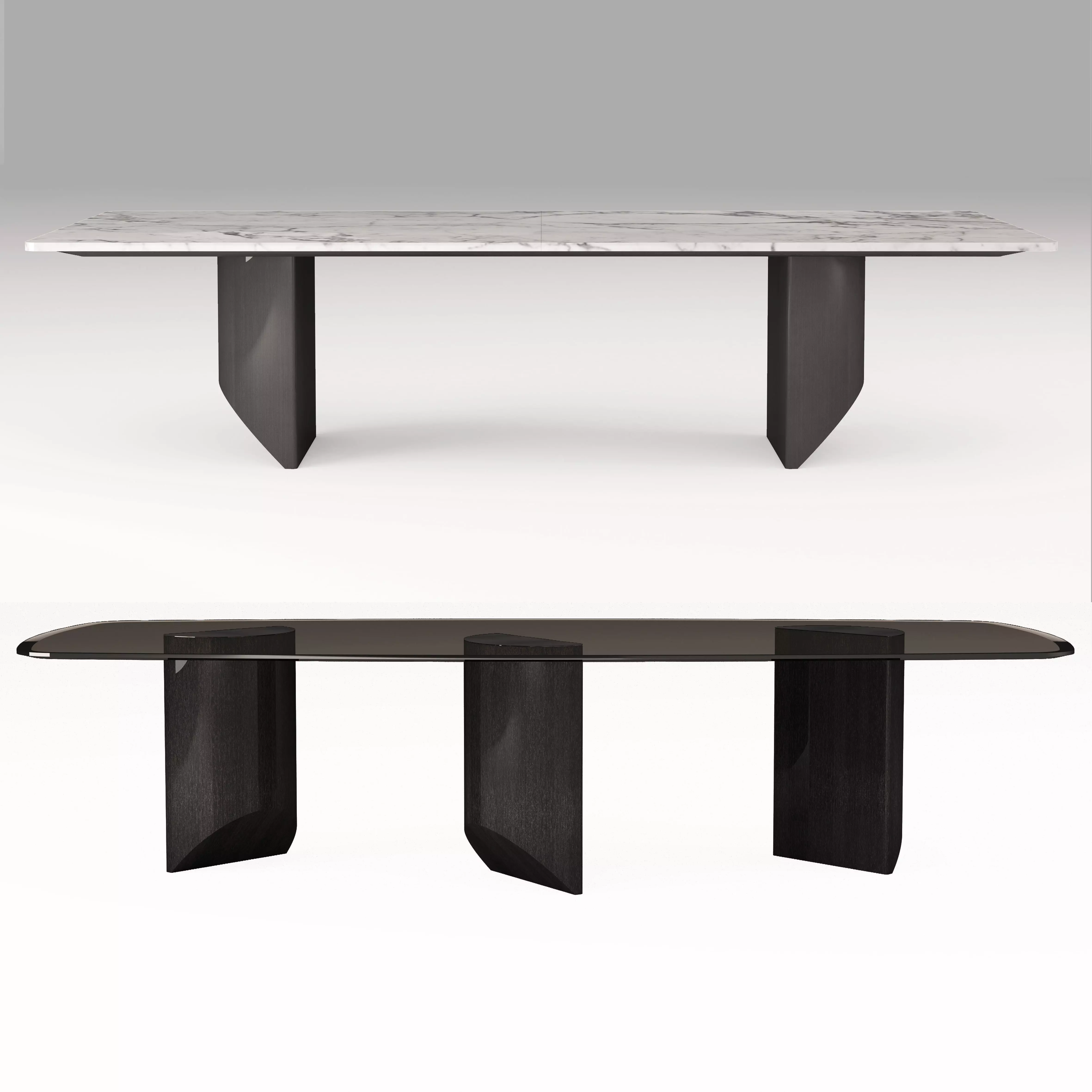 Table in the Calacatta marble is with a Malt-coloured satin metal base.Table in bronzed glass is with base in a Moka-coloured wenge wood finish.