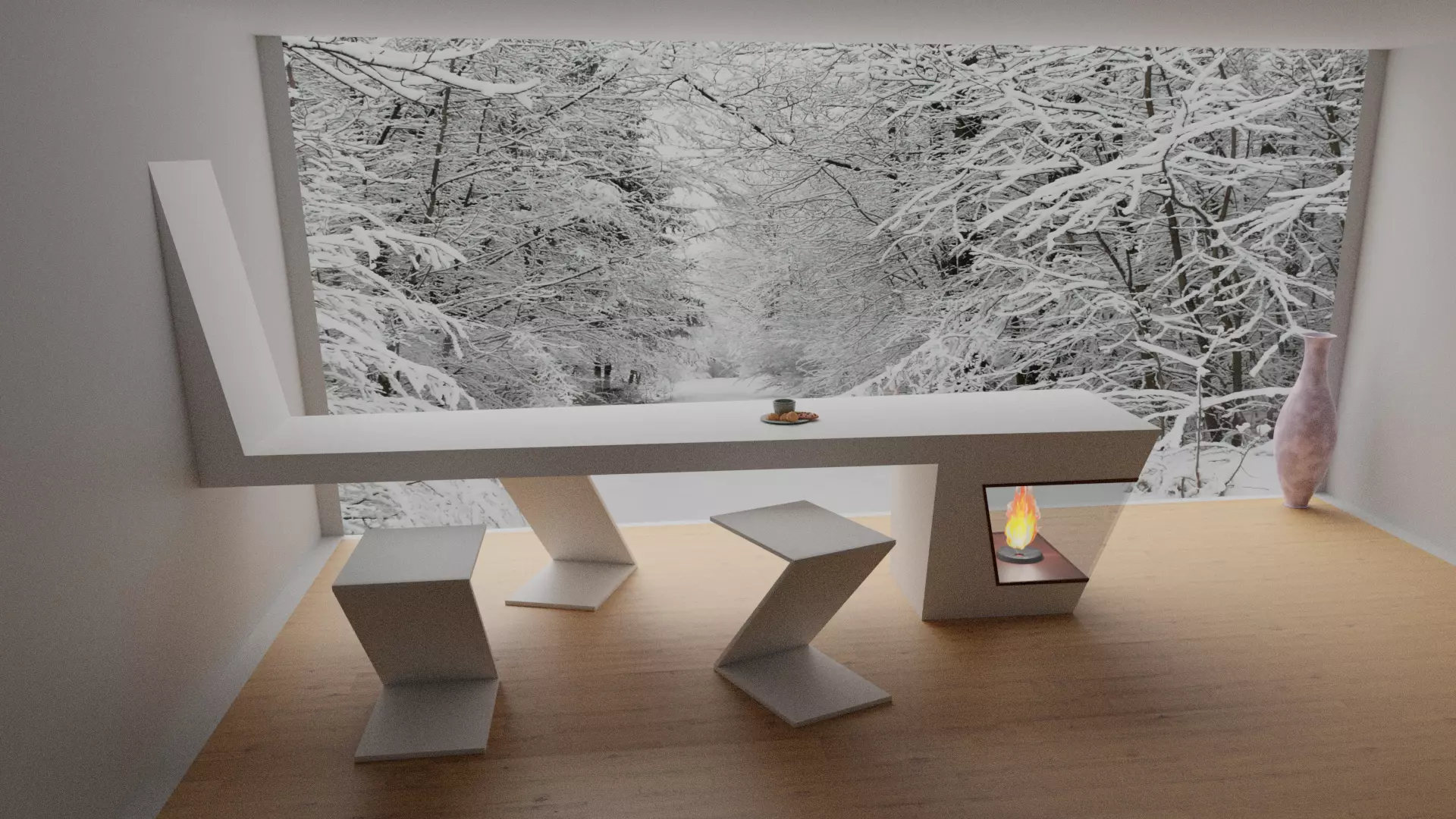Window with winter viewOutside the panoramic window, a breathtaking view unfolds, showcasing the enchanting winter forest. The world beyond is transformed into a winter wonderland, with a pristine blanket of snow covering every surface. The trees stand tall, their branches heavy with glistening frost, creating a mesmerizing scene straight out of a fairy tale.