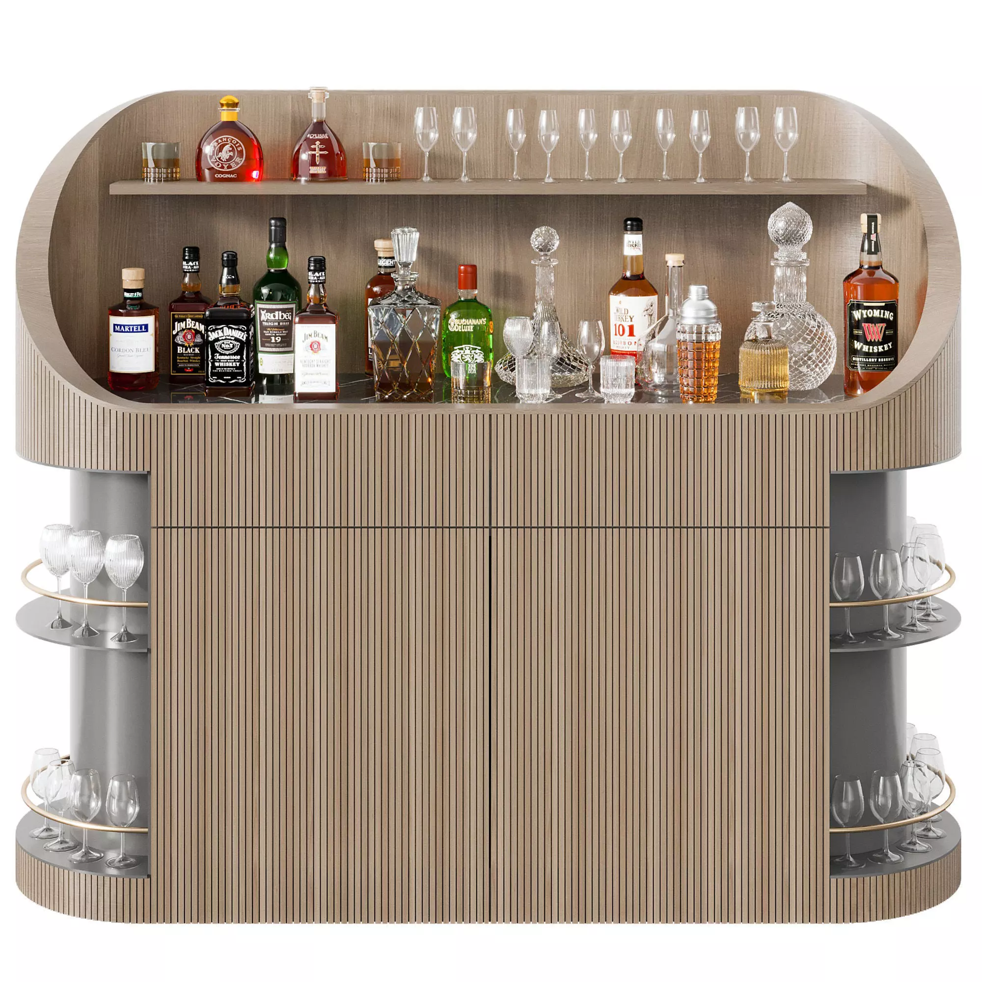 Wine Cellar No. 11High-quality 3D model of a contemporary home mini bar with a stylish rounded structure and vertical paneling. The shelves and countertop are detailed with assorted bottles, glasses, and accessories, giving the piece a lively and authentic look. Ideal for architectural visualization, interior renderings, or design projects where a functional and decorative bar unit enhances the atmosphere of dining rooms,