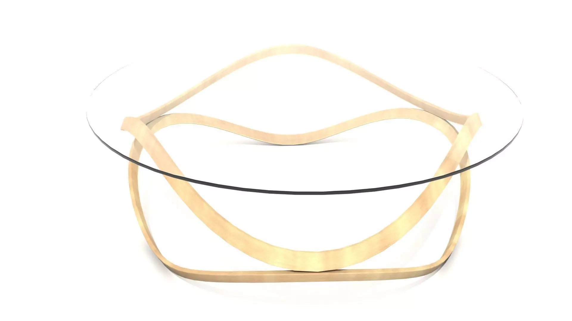 A cleverly designed and modern coffee table comprised of two opposing wooden undulating rings stacked on top of each other with a glass table top