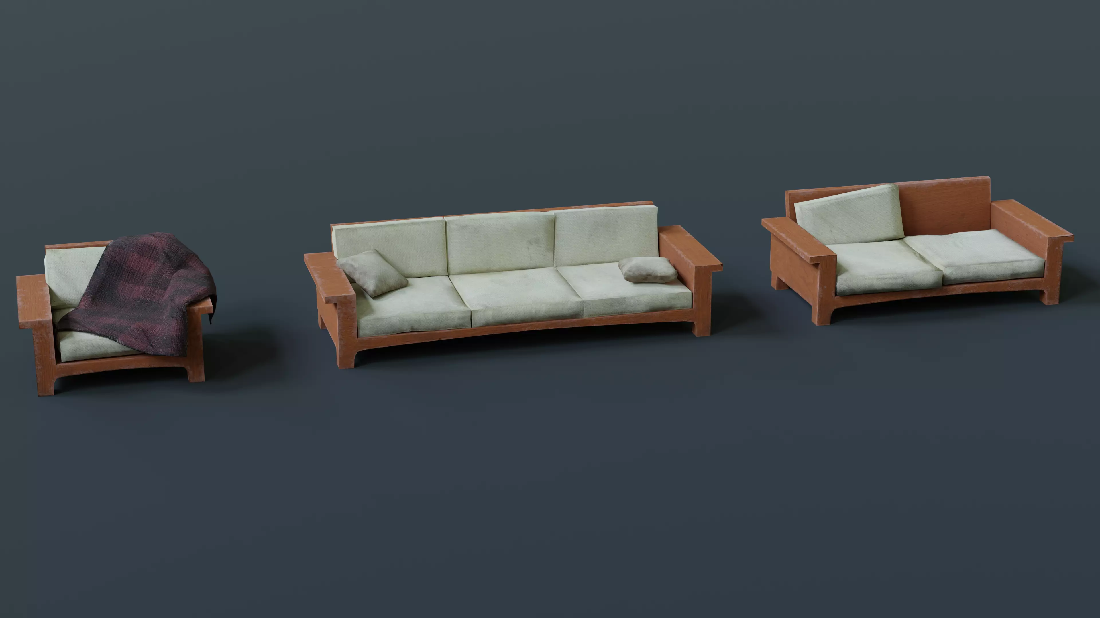 3 very worn sofa models with 4k textures. Sofas are LowPoly, game-ready assets.