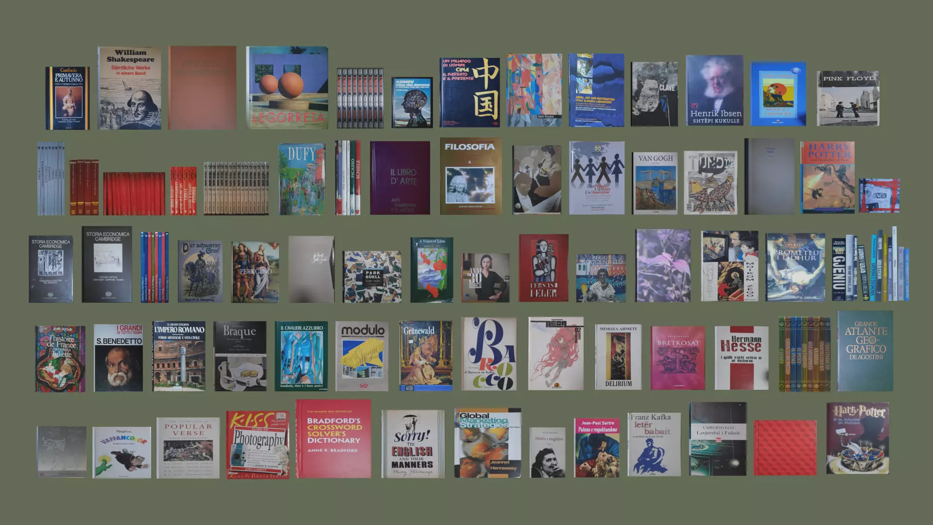 This 3D model features a collection of over 70 classic books with titles in English, Italian, and Albanian. Each book has a unique cover and spine design, perfect for adding variety to libraries, bookshelves, or interior scenes. Ideal for use in games, animations, and architectural visualizations.