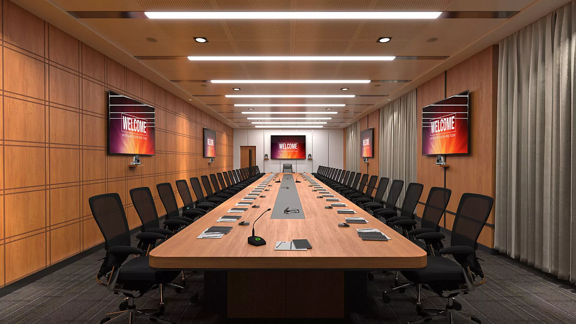 The 3D model of the well-designed 45-seater conference room with wooden paneling and the latest technology brings the space to life, showcasing its elegant design and incorporating the latest technology elements such as Sennheiser SL BOUNDARY 114-S and Mic that contribute to a productive meeting environment. The 3D model is ready to use and easily editable as per user's requirement. I believe that incorporating this 3D model into your presentation will greatly enhance its appeal and visual impact.