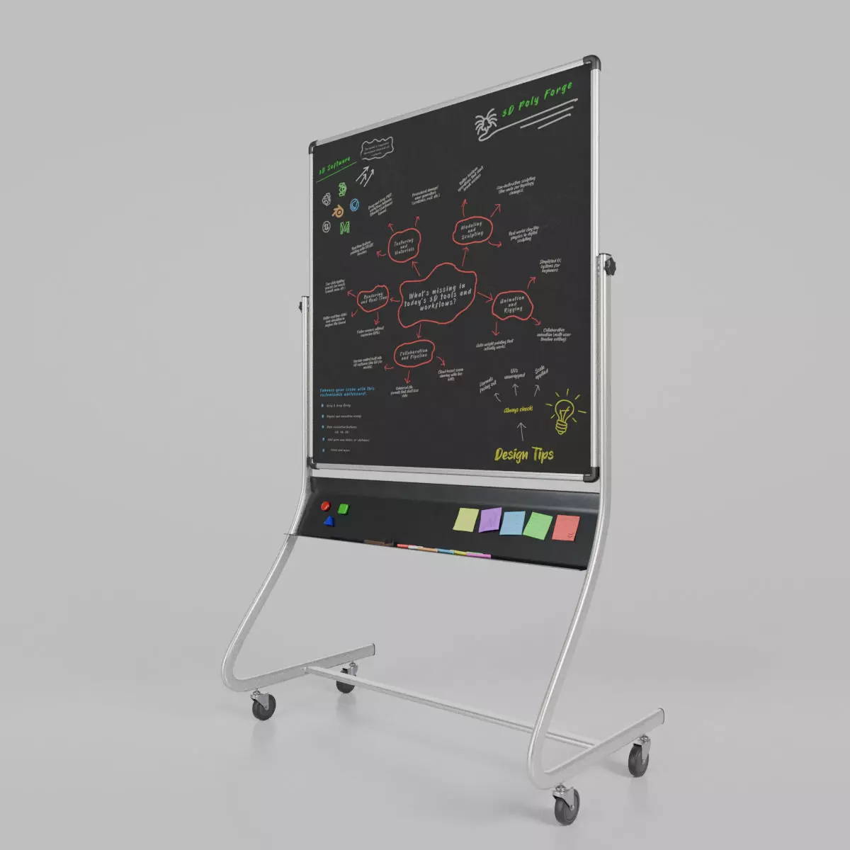 A versatile 3D writing board with a double-sided writing board and an adjustable stand, designed for architectural visualization, virtual training, game environments, and educational simulations. The model features a customizable surface and includes optional accessories for enhanced realism.