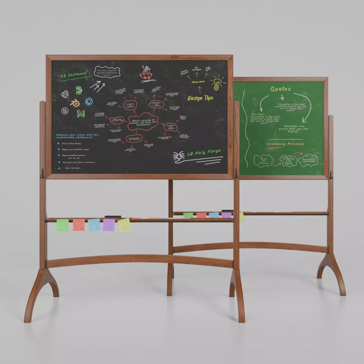 A high-quality 3D asset featuring a functional double-sided chalkboard writing surface (blackboard/greenboard) with an adjustable stand, perfect for architectural visualization, virtual training, game environments, and educational applications. This meticulously designed model includes realistic accessories and customizable surfaces for maximum versatility.