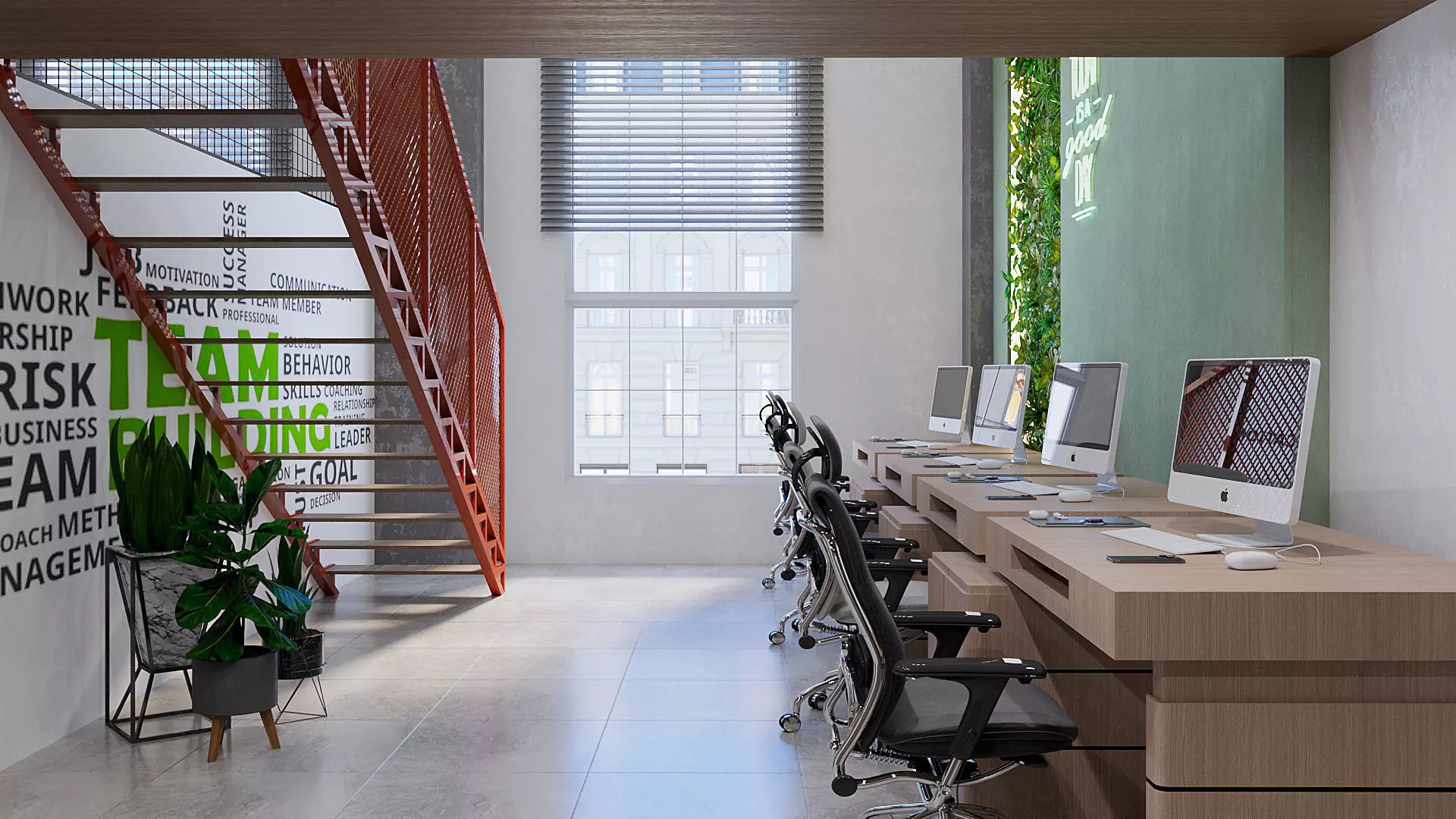 The staircase often acts as a visual centerpiece within the office.