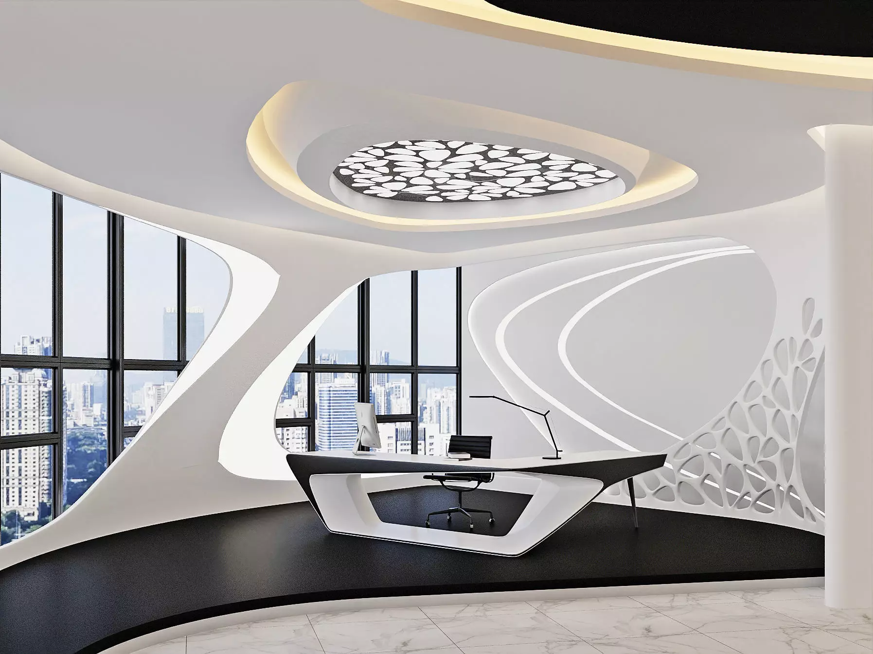 Experience a Futuristic Executive Office designed with flowing parametric architecture and a refined minimalist palette.This high-end workspace features sculptural wall geometry, an iconic curved desk, and a dynamic skylight pattern, blending form and function seamlessly.