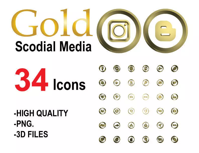 Gold social media icons includes PNG and 3D model for rendering.
