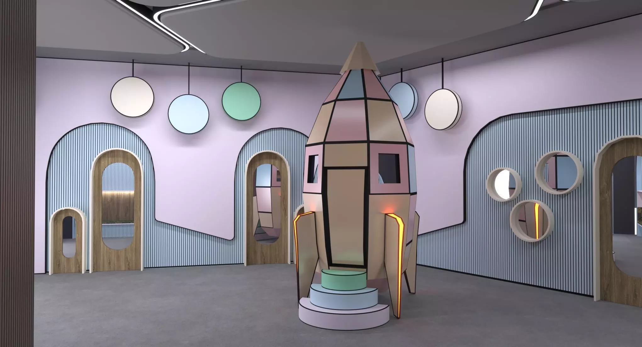 After the modern entrance, there is a transition to the other room, whose wall and ceiling designs are a whole. This room, which is the spaceship and resting area, is a passage to reach other needed areas. There is 1 elevator and many doors, you can use it as you wish.