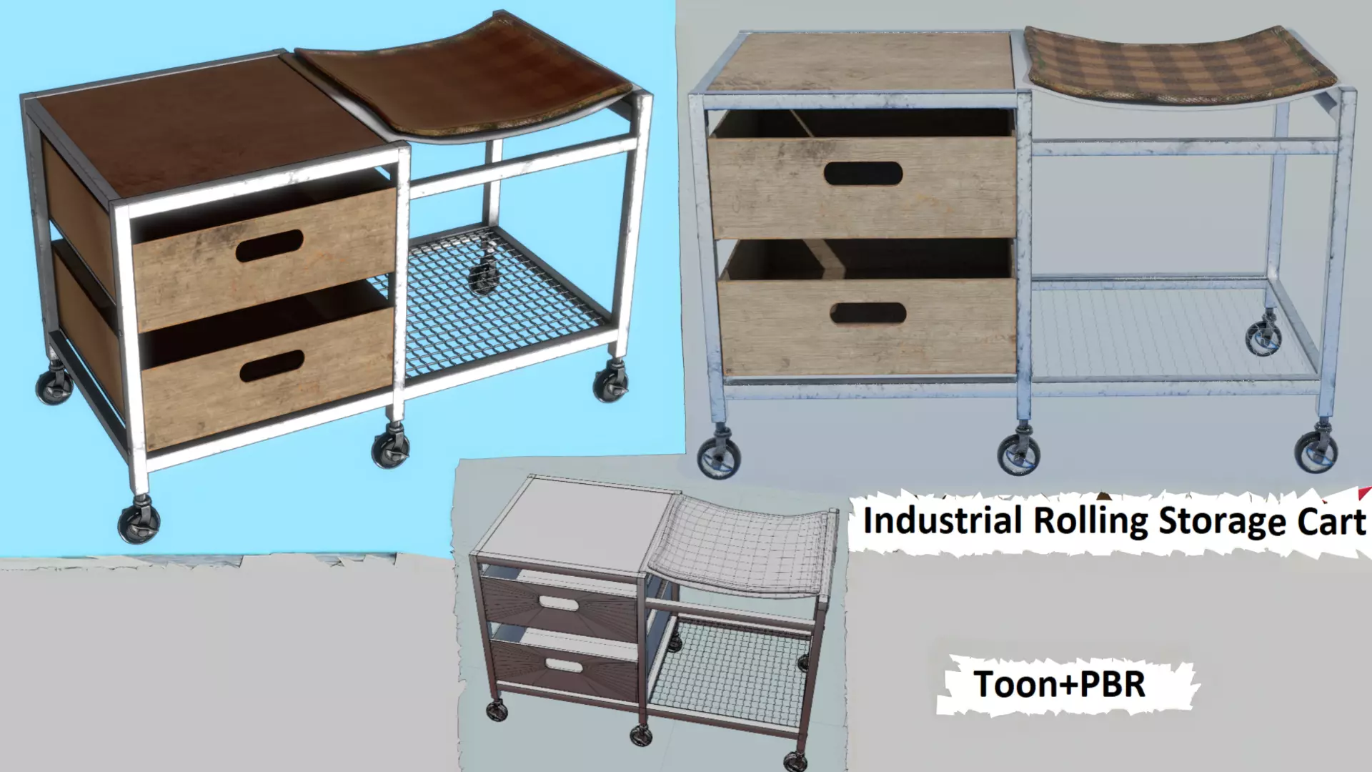 A fully detailed Industrial Rolling Storage Cart designed for versatility in games, animations, and visualization projects. The model features a sturdy metal frame with a distressed finish, dual wooden drawers, a mesh lower shelf, and a cushioned seat pad. Functional caster wheels allow for realistic mobility in scene animations.