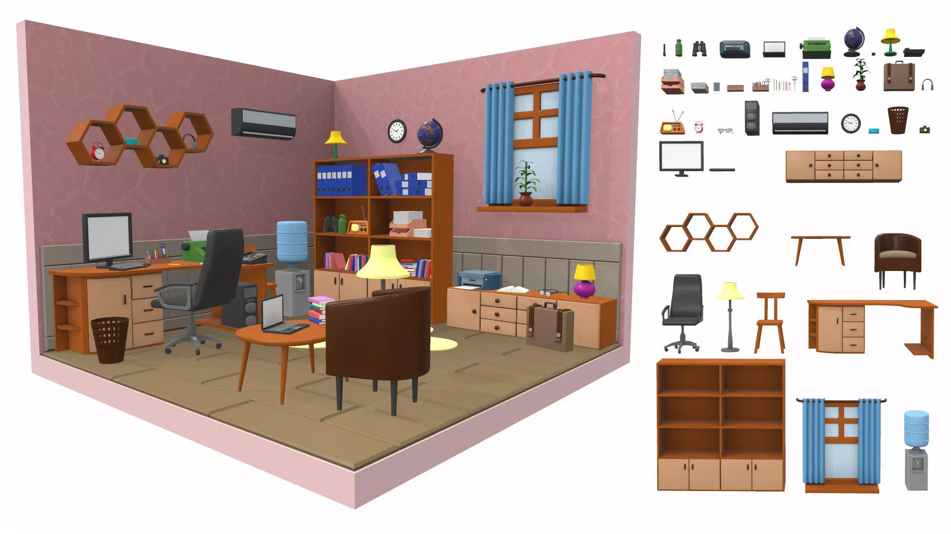 The model isometric cartoon office room is located in zero coordinates. UVW mapping created, all textures are in the zip archiveThe model isometric cartoon office room was created in 3Ds Max and textured in 3D coat. Previews of the model isometric cartoon office room are made in the Marmoset Toolbag program.