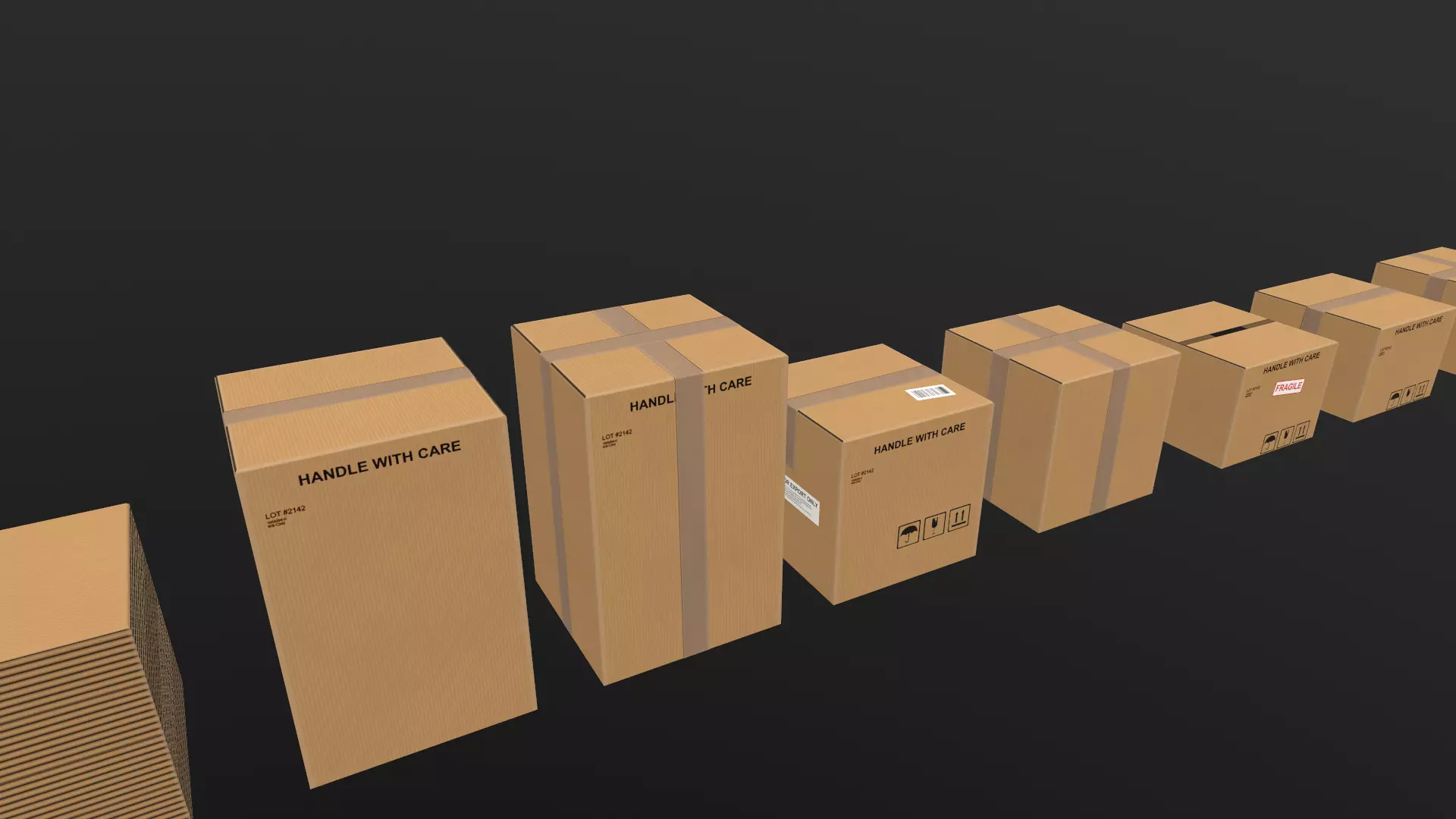Pack of 18 low-poly cardboard boxes of different sizes with different details. Polycount ranges from 30 - 72 per box. All models use the same material, available in 1k and 512px (approx 512 and 256 px/m texel density, respectively), with versions adapted for Unreal Engine and Unity.