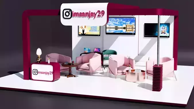 This 3D model delivers a professional setup that includes: Elegant booth structure with stylish walls & branding space Comfortable lounge seating with chairs & tables Digital display screens for ads, logos, and product presentations High-quality textures and realistic materialsOptimized geometry for smooth performance in VR/AR