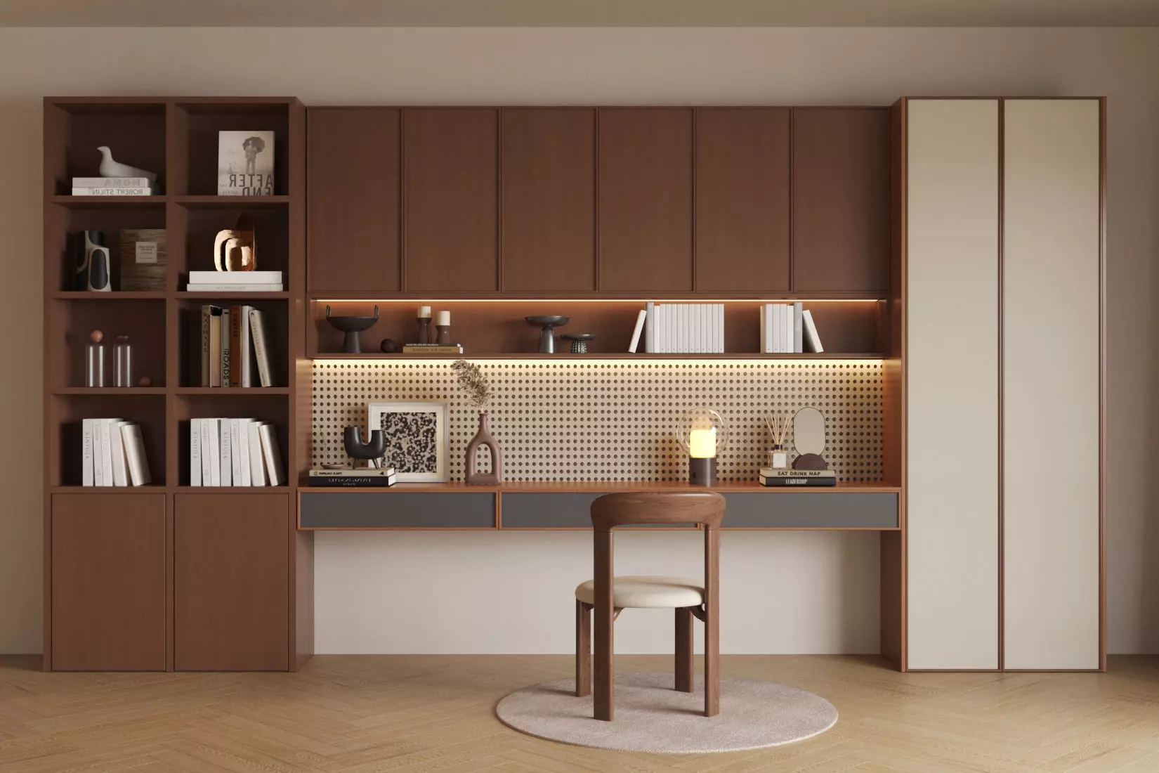 This is a mid-century modern study. Dominated by a warm dark walnut finish, paired with off-white cabinet doors and a pegboard backdrop, it creates a retro yet contemporary atmosphere. The full-wall storage system integrates closed cabinets, open shelves, and a floating desk, providing ample space for books and clutter while allowing flexible display of art pieces and stationery via the pegboard. The walnut dining chair, paired with a warm-toned table lamp, combined with integrated lighting and thoughtful details, makes the entire space a quiet, retro-inspired corner ideal for reading and working.