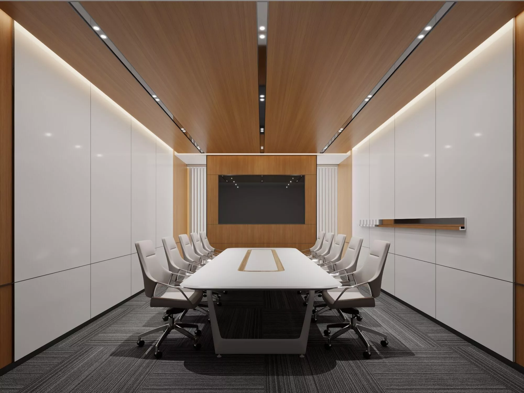Professional high-quality 3D complete scene of a Modern Corporate Conference Room meticulously crafted for high-end interior visualization and architectural projects. This comprehensive asset features a sophisticated boardroom environment including a large minimalist conference table a series of ergonomic executive chairs high-gloss wall panels a stylish wood-veneered ceiling with integrated linear LED lighting and a professional wall-mounted multimedia display area.