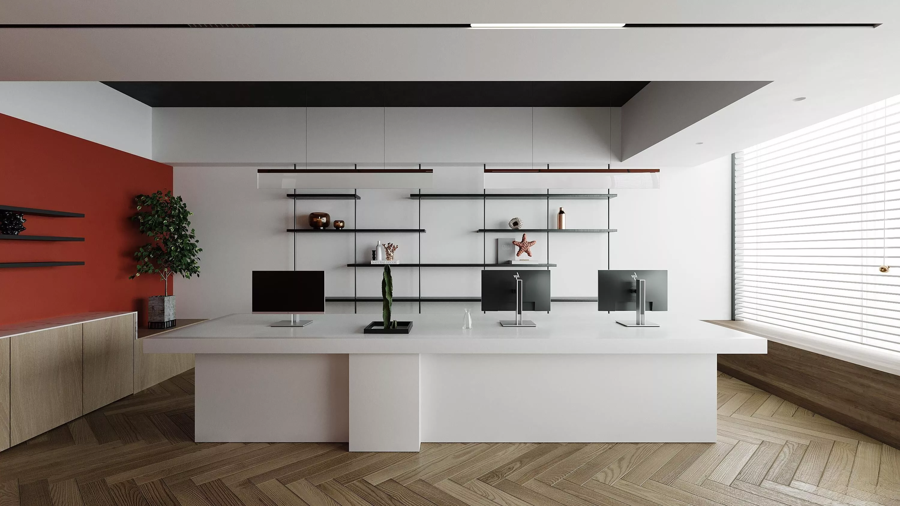 This is a complete ready-to-render 3D interior scene of a high-end modern minimalist corporate office space. The overall space adopts a restrained advanced color matching system, with a striking burnt accent red wall integrated into the pure white main space, matched with light wood herringbone flooring, large suspended office workbench, layered metal wall shelving system, intelligent linear ceiling lighting, and soft window blind daylighting. The scene is equipped with complete office equipment models, exquisite decorative ornaments, diversified indoor green plant landscaping, and delicate PBR physical material textures. Professionally tuned ambient lighting and camera composition create a clean, spacious, high-end quiet modern office atmosphere.The asset package contains fully completed scene source files: Blender (Cycles & Eevee compatible), 3ds Max with Corona Renderer, universal OBJ & FBX formats. All models are built with optimized clean quadrilateral topology, with fully pre-configured full-set PBR material texture maps.Full cross-software compatibility is realized. Material node setups, texture mapping, scene lighting environment and rendering presets have all been manually preset for each file format. You can open the file and render instantly without extra plugin installation, manual material adjustment or additional export operations. All internal texture file names are standardized, which greatly facilitates later secondary design, modification and asset calling.This interior scene is ideal for office architectural visualization, commercial space rendering, corporate design display, interior concept art creation, high-end space portfolio showcase and commercial design presentation projects. Please feel free to contact me for customized modification requirements. Your positive review will be strong support for my creative work. Enjoy your asset!