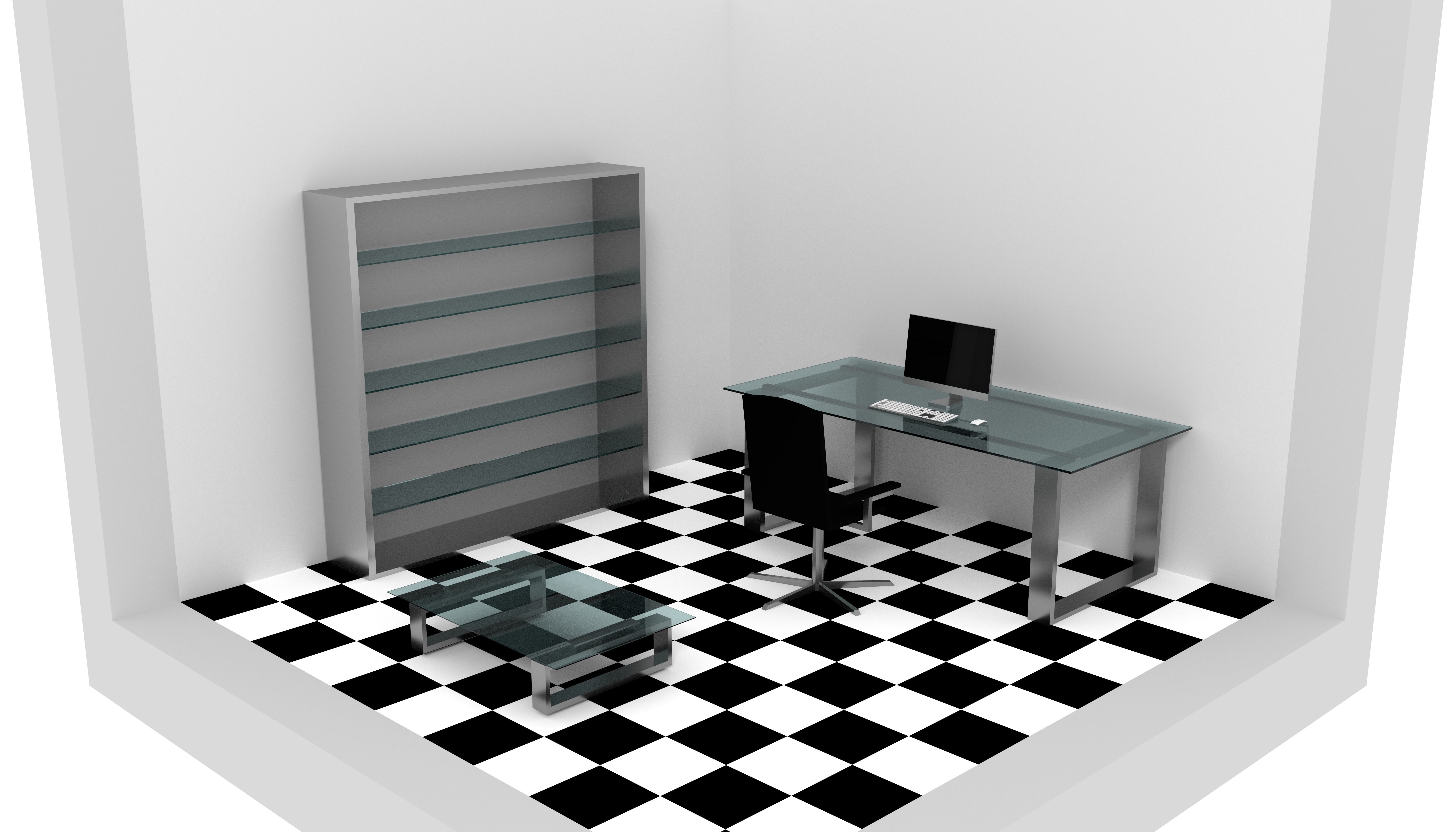 You get in the scene + modern glass desk + modern glass table + computer + keyboard + mouse + modern glass bookshelf