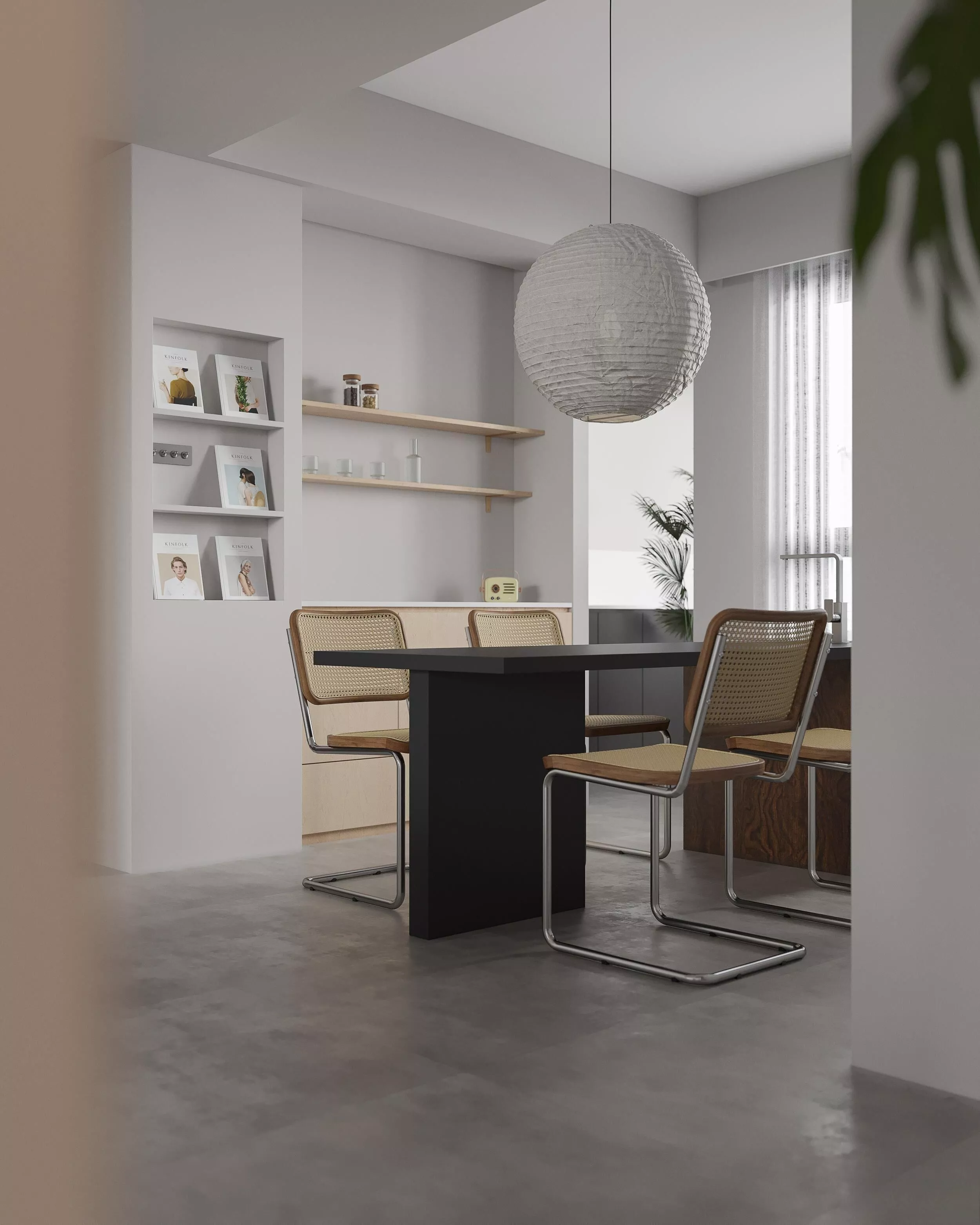 This is a complete ready-to-render full 3D interior scene of modern wabi-sabi minimalist office space with low-saturation neutral tone system. The whole space integrates multi-functional composite layout including leisure dining area and open working area, built with restrained gray matte wall base, delicate light wood texture furniture, clean geometric structure and soft advanced color matching. The scene contains oversized wrinkled paper pendant lamp, solid wood wall-mounted open shelving, built-in storage cabinetry, rattan woven dining chairs, large central office island desk, ergonomic office swivel chairs, black linear suspended lamps, multi-layer wall decorative panels, indoor green plant landscaping, vintage small ornaments, magazine display furnishings and soft venetian blind daylighting system. It is equipped with delicate realistic PBR physical textures covering wood, rattan, stone, metal and matte paint materials, professionally tuned layered ambient lighting and optimized camera composition, creating a quiet, calm, textured high-end minimalist workspace atmosphere that balances business functionality and life aesthetic.The asset package includes fully completed whole scene source files: Blender (Cycles & Eevee compatible), 3ds Max with Corona Renderer, universal OBJ & FBX formats. All scene models adopt optimized clean quadrilateral topology, with fully pre-configured complete set of PBR material texture maps.Full cross-software compatibility is fully optimized. Material node setups, texture mapping, overall scene lighting environment and rendering presets have all been manually preset for every software format. Users can open the file and render instantly without extra plugin installation, manual material adjustment or additional export operations. All internal texture file names are uniformly standardized and renamed for convenient later secondary design, modification and asset calling. The integrated scene supports both panoramic overall space rendering and exquisite partial detail close-up shooting at the same time.This interior scene is ideal for office architectural visualization, commercial workspace rendering, studio space design display, interior concept art creation, high-end lifestyle space portfolio showcase and interior design presentation projects. Please feel free to contact me for customized modification requirements. Your positive review will be great support for my creative work. Enjoy your asset!