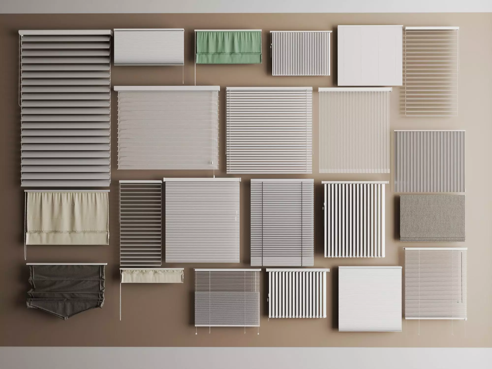 High-quality photorealistic 3D model collection of modern window blinds, roman shades, and roller shades. This extensive pack includes a wide range of styles in neutral and minimalist colors (white, light gray, beige, taupe, off-white, linen textures, subtle stripes, solid fabrics) – featuring horizontal slat venetian blinds (aluminum/wood-look), pleated roman shades with fabric folds, roll-up blinds, scalloped valances, cord/chain mechanisms, and various widths/heights. Models show realistic fabric/metal textures, soft pleats, light diffusion effects, and clean hardware details.Perfect for architectural visualization, interior design projects, home decor rendering, real estate presentations, furniture/e-commerce scenes, game environments (Unity/Unreal Engine), VR/AR walkthroughs, or window treatment mockups.Key features: