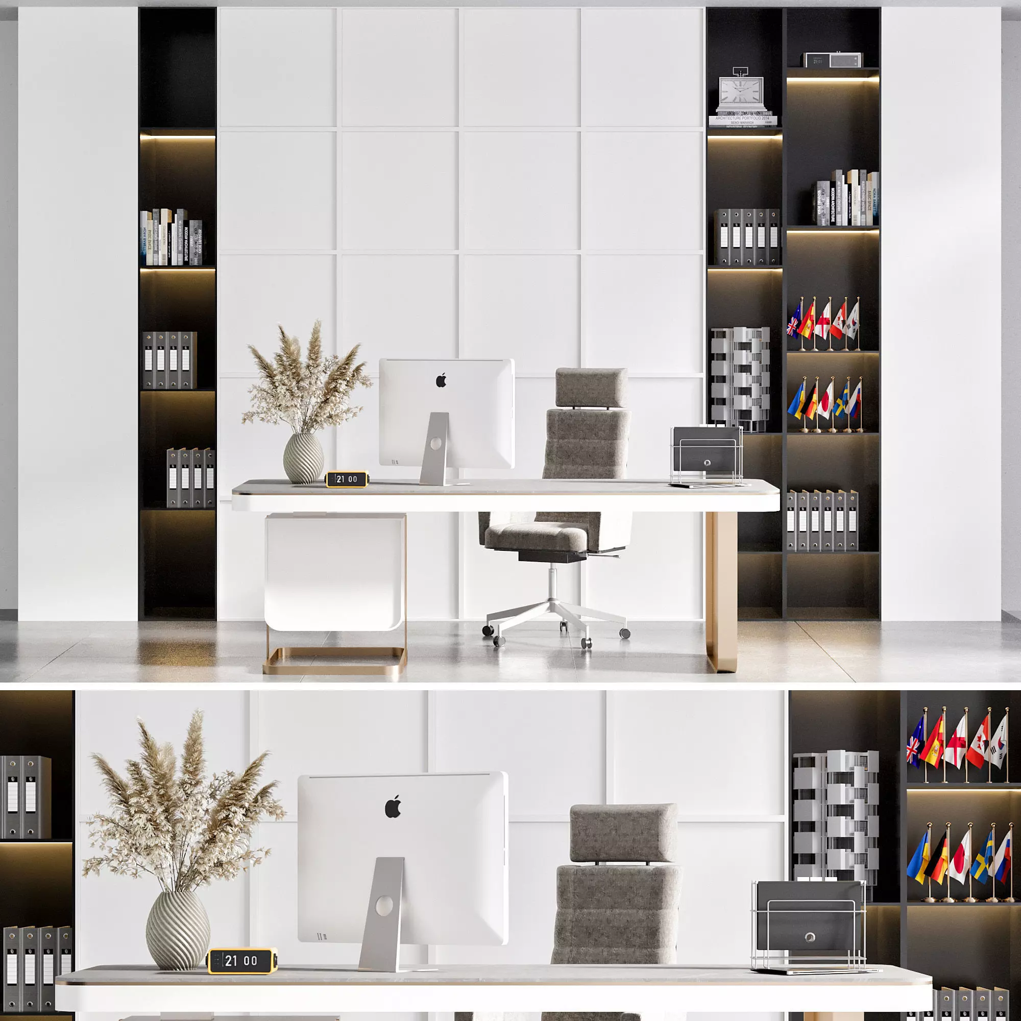 This high-quality 3D model showcases a modern executive office setup featuring a sleek desk, ergonomic office chair, and a stylish shelving unit with built-in lighting. The scene includes realistic details such as books, binders, decorative vases, a desktop computer, and international flags, making it perfect for corporate interior visualizations, workspace design projects, or office furniture presentations.