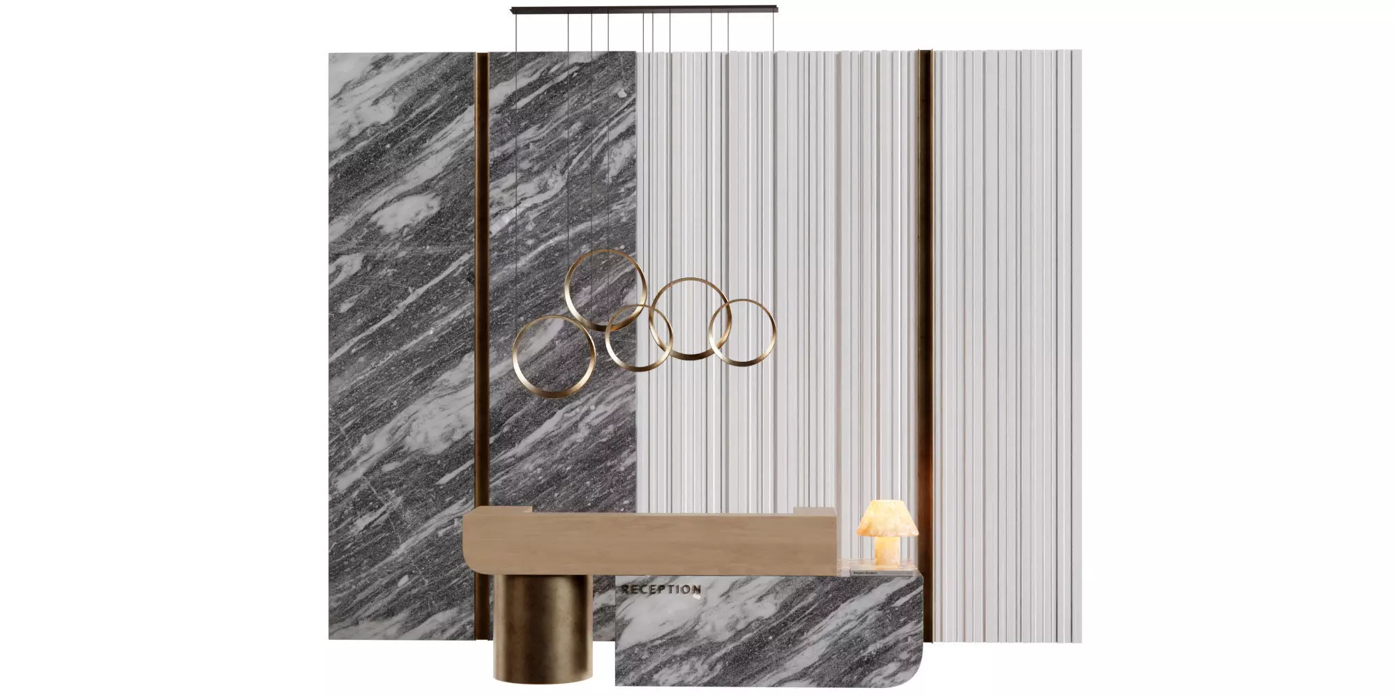 3D model, which includes: reception/reception desk, decor, table lamp PARACHILNA Petra Table Lamp by Monologue London, pendant lamp/chandelier MOONLIGHT By Quasar BY Hoffmann Kahleyss, decorative wall panels, book