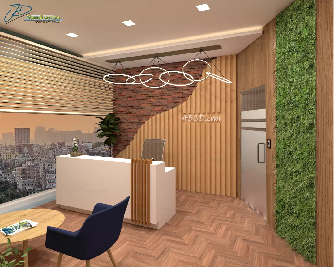 Modern office reception area interior 3d. Great design combination with brick and rafters at front wall gives warm welcome with Wooden flooring, green wall, stone wall.