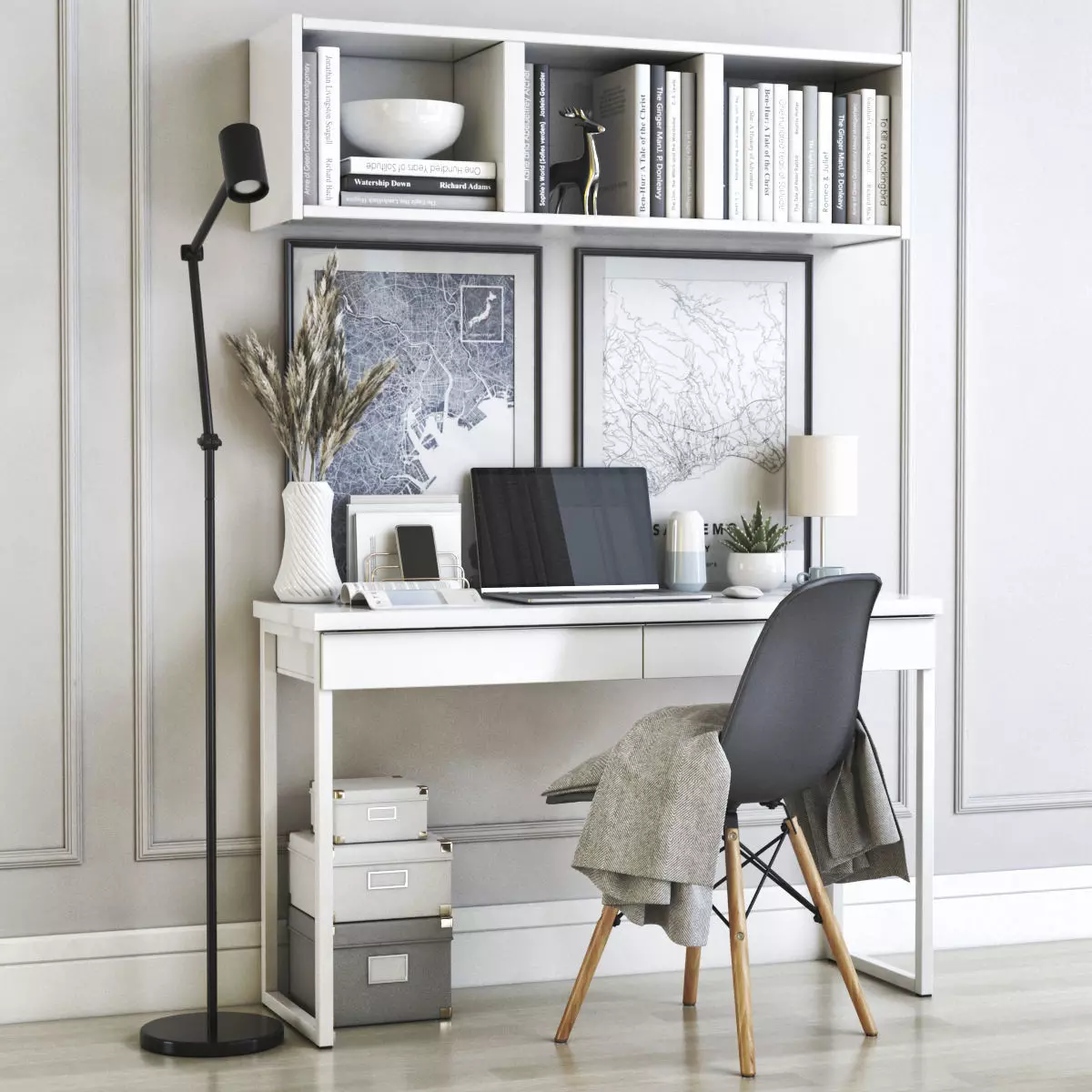 1. BESTA BURS Writing desk, glossy white 120x40 cm.Can be placed anywhere in the room because the back is finished.The high gloss surfaces reflect light and give a vibrant look.